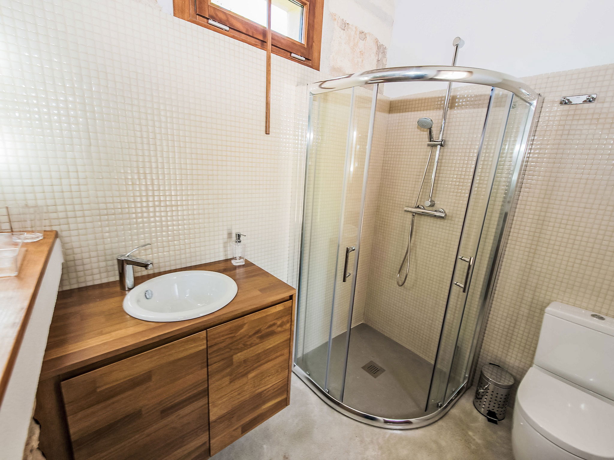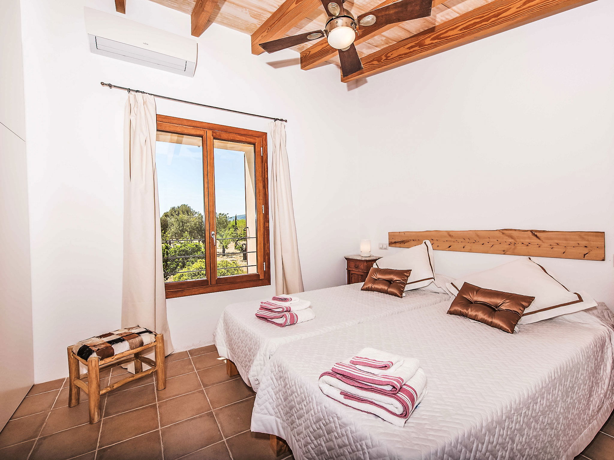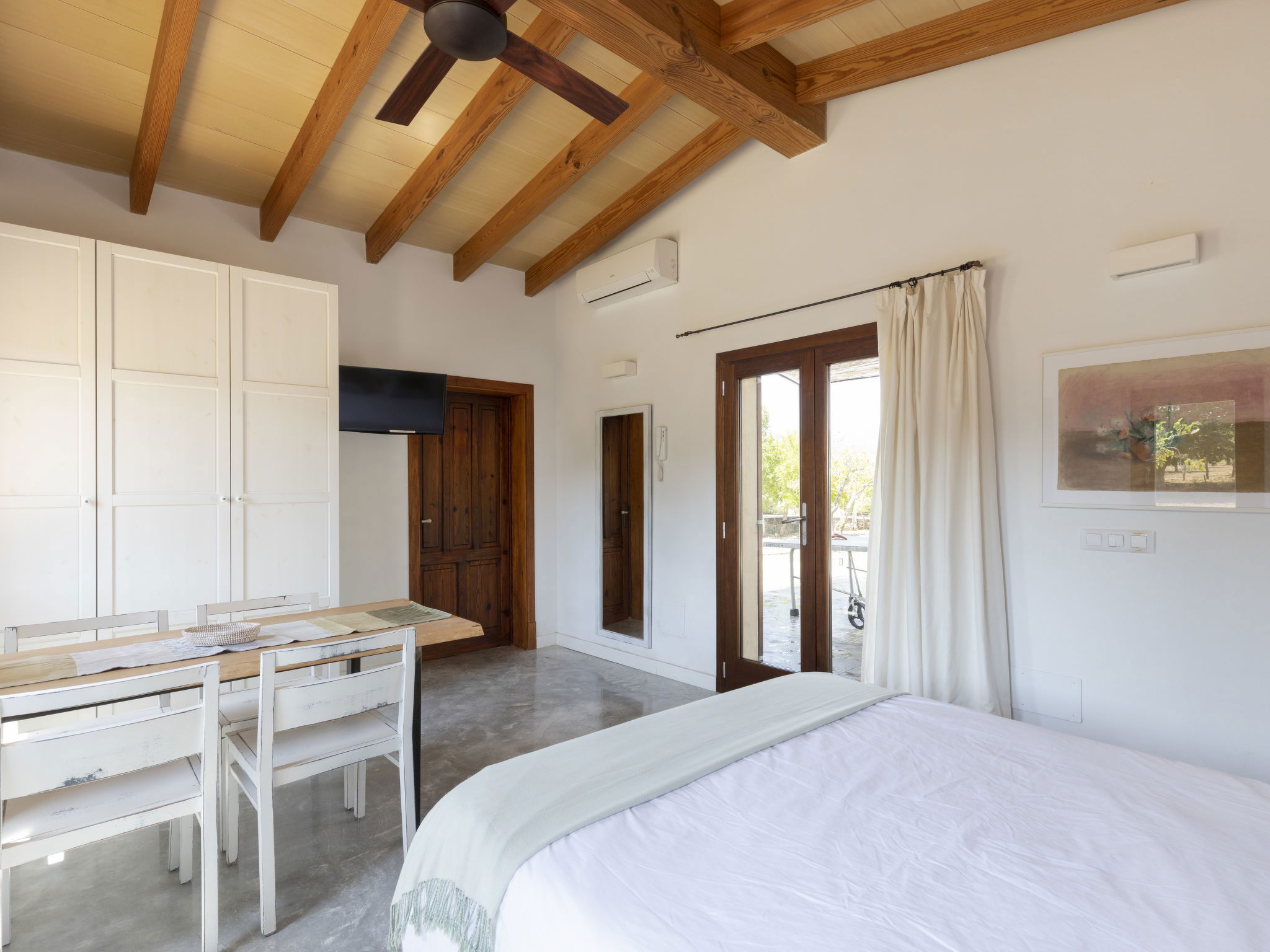 "Cas Ciutada", 5-room villa 200 m2 on 2 levels. Object suitable for 8 adults. Spacious and bright, fully renovated, comfortable and modern furnishings: living/dining room with Scandinavian wood stove (only for decoration), dining table, digital TV, flat screen, air conditioning and forced-air heating. Exit to the patio. 1 double bedroom with 1 bed (90 cm, length 190 cm), 1 pull-out bed (2 x 90 cm, length 190 cm), fan. Exit to the terrace. 1 large double bedroom with 1 french bed (150 cm, length 200 cm), shower/WC, air conditioning and forced-air heating. Exit to the terrace. Kitchen (oven, dishwasher, 4 ceramic glass hob hotplates, toaster, kettle, microwave, freezer, electric coffee machine) with dining table. Exit to the terrace. Shower/WC. Upper floor: 1 double bedroom with 2 beds (90 cm, length 200 cm), air conditioning and forced-air heating. 1 double bedroom with 2 beds (90 cm, length 200 cm), air conditioning and forced-air heating. Large patio, lawn, porch. Terrace furniture, barbecue, deck chairs (8), covered balcony. Very beautiful view of the mountains and the countryside. Facilities: washing machine, iron, children's high chair, baby cot for up to 2 year olds, hair dryer. Internet (WiFi, free). Parking (fenced) at the house. Please note: one double bedroom is outside the apartment. Non-smoking house. Fire extinguisher, no lift. No internal connecting door between the separated properties. The pool mentioned in the description is for private use. Note: the double bedroom which is independent from the main house has doors adapted for wheelchairs (77 cm wide). The sink and toilet are normal standard size. ETV/4941 // Reg. Nr.: ESFCTU00000702200023993100000000000000000000ETV/49412