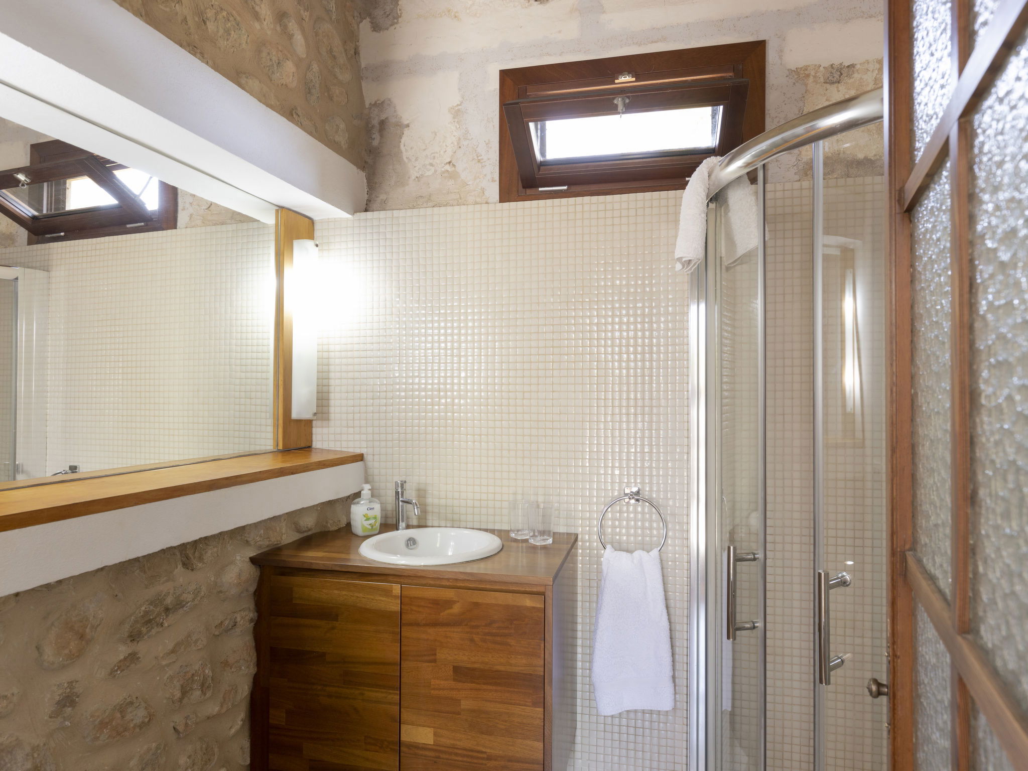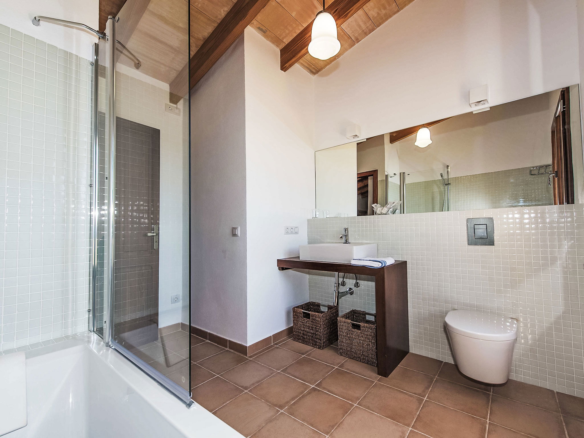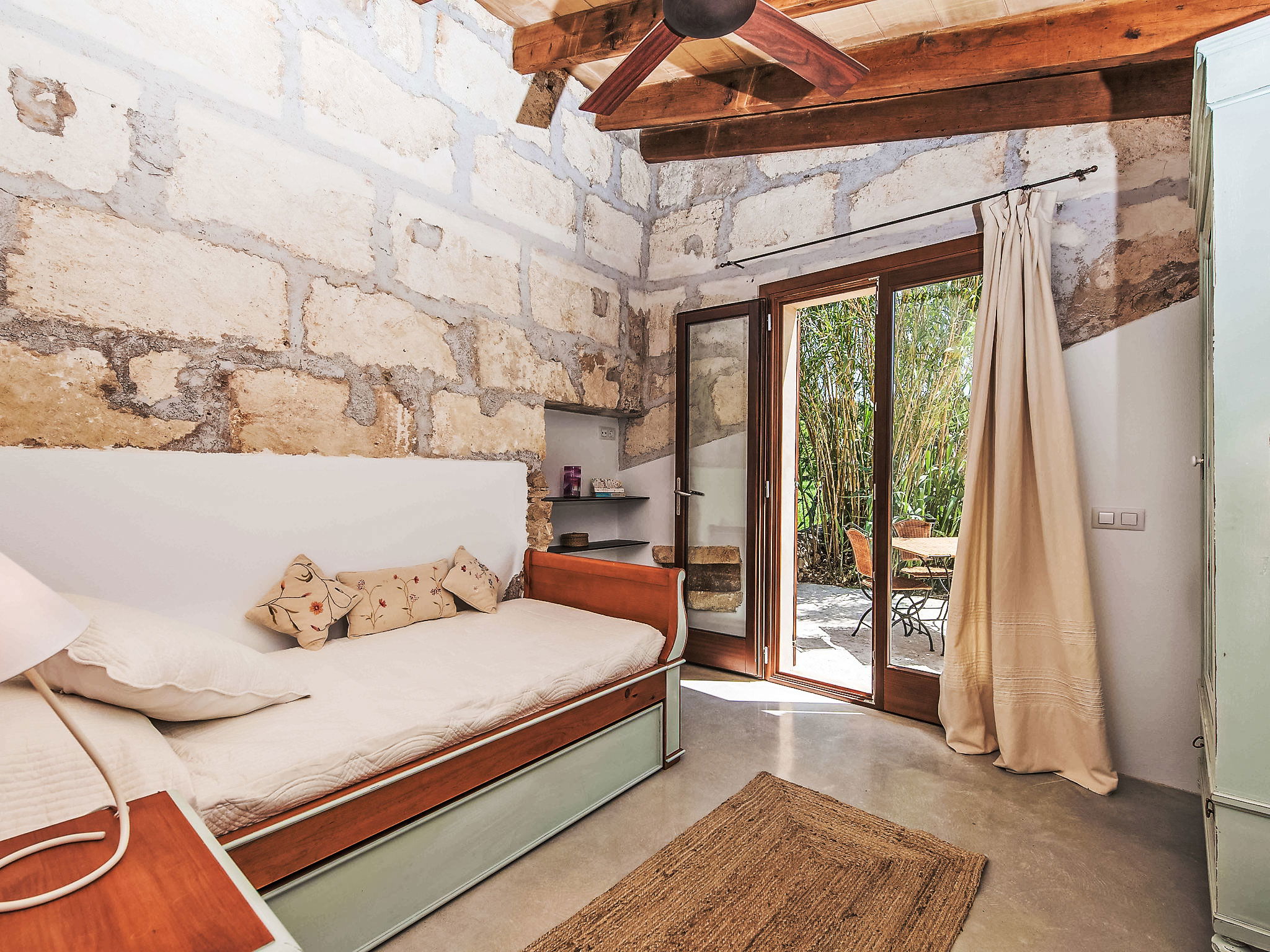 "Cas Ciutada", 5-room villa 200 m2 on 2 levels. Object suitable for 8 adults. Spacious and bright, fully renovated, comfortable and modern furnishings: living/dining room with Scandinavian wood stove (only for decoration), dining table, digital TV, flat screen, air conditioning and forced-air heating. Exit to the patio. 1 double bedroom with 1 bed (90 cm, length 190 cm), 1 pull-out bed (2 x 90 cm, length 190 cm), fan. Exit to the terrace. 1 large double bedroom with 1 french bed (150 cm, length 200 cm), shower/WC, air conditioning and forced-air heating. Exit to the terrace. Kitchen (oven, dishwasher, 4 ceramic glass hob hotplates, toaster, kettle, microwave, freezer, electric coffee machine) with dining table. Exit to the terrace. Shower/WC. Upper floor: 1 double bedroom with 2 beds (90 cm, length 200 cm), air conditioning and forced-air heating. 1 double bedroom with 2 beds (90 cm, length 200 cm), air conditioning and forced-air heating. Large patio, lawn, porch. Terrace furniture, barbecue, deck chairs (8), covered balcony. Very beautiful view of the mountains and the countryside. Facilities: washing machine, iron, children's high chair, baby cot for up to 2 year olds, hair dryer. Internet (WiFi, free). Parking (fenced) at the house. Please note: one double bedroom is outside the apartment. Non-smoking house. Fire extinguisher, no lift. No internal connecting door between the separated properties. The pool mentioned in the description is for private use. Note: the double bedroom which is independent from the main house has doors adapted for wheelchairs (77 cm wide). The sink and toilet are normal standard size. ETV/4941 // Reg. Nr.: ESFCTU00000702200023993100000000000000000000ETV/49412