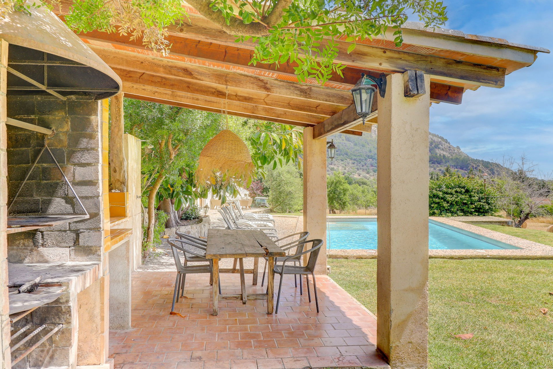 ☀ Covered barbecue area with outdoor dining, ideal for family meals even in low season.