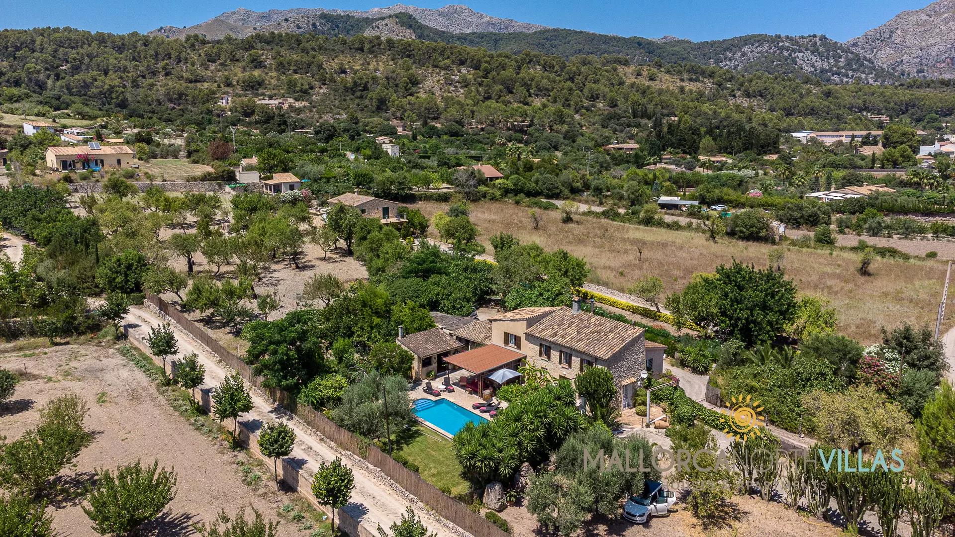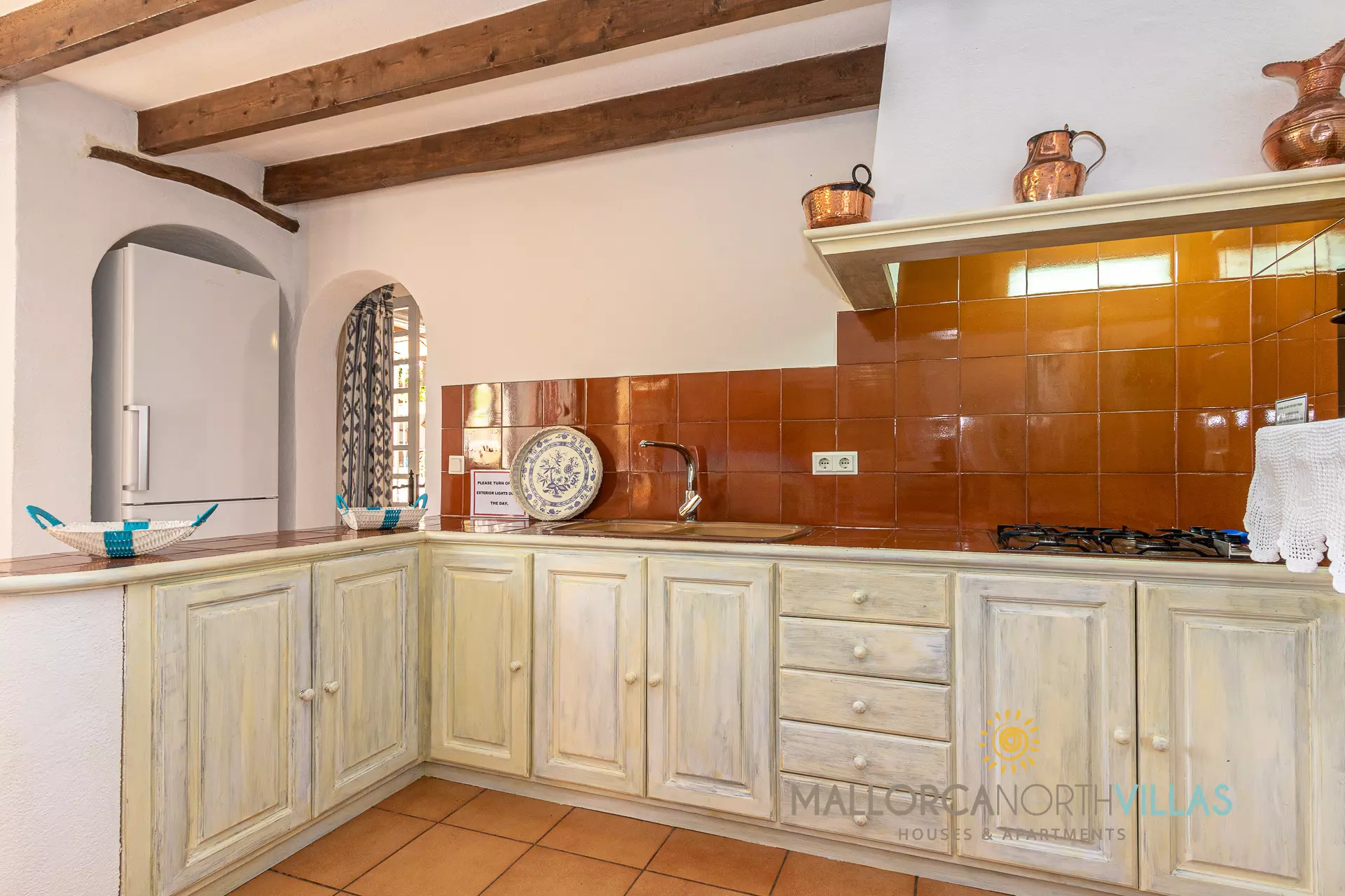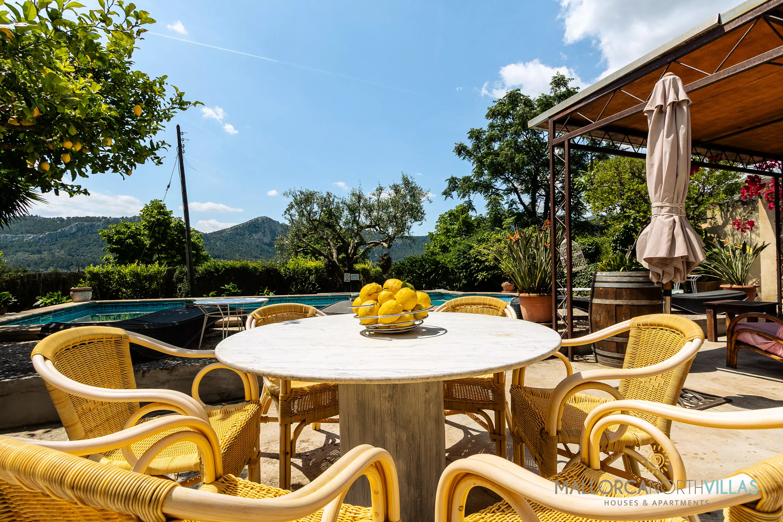 Upstairs: three comfortable bedrooms (one with a double bed and two with single beds) and a second bathroom. All rooms offer spectacular views of the Serra de Tramuntana, the Mallorcan countryside, and the iconic Puig de Maria.