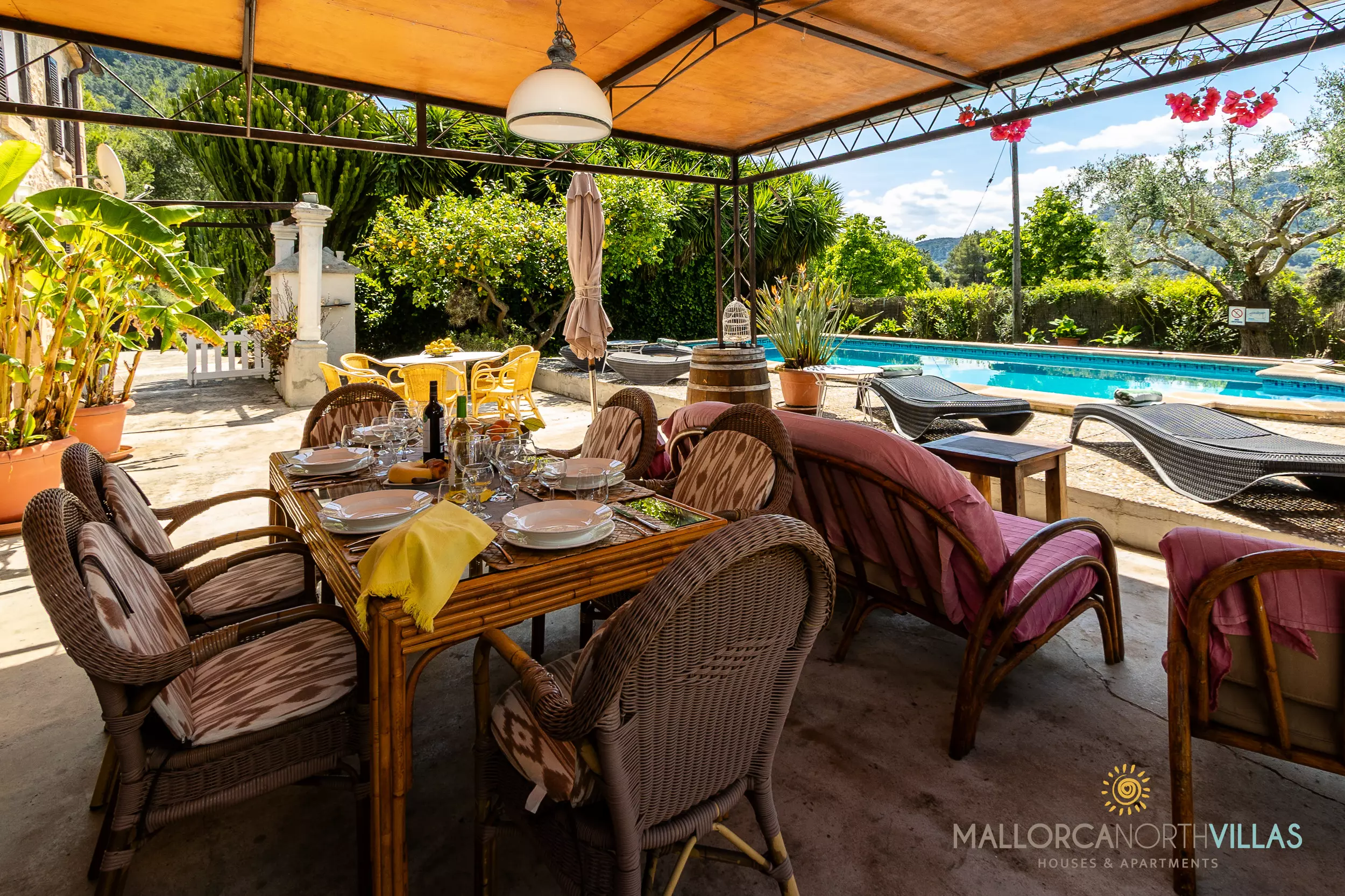 The outdoor area is ideal for unwinding and enjoying the Mediterranean climate. Relax on the furnished terrace, enjoy a barbecue in the private garden, or cool off in the private pool, ideal for sunny days in Mallorca.