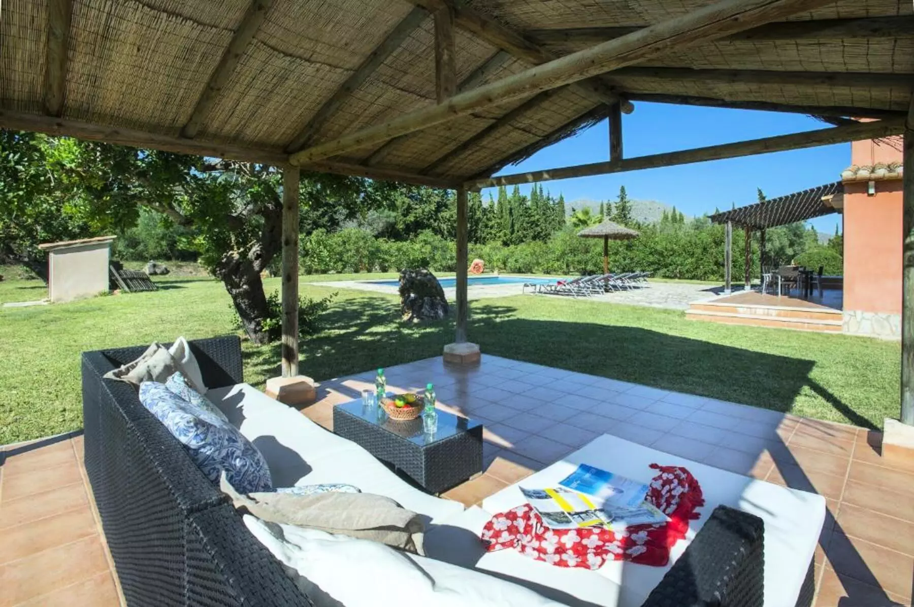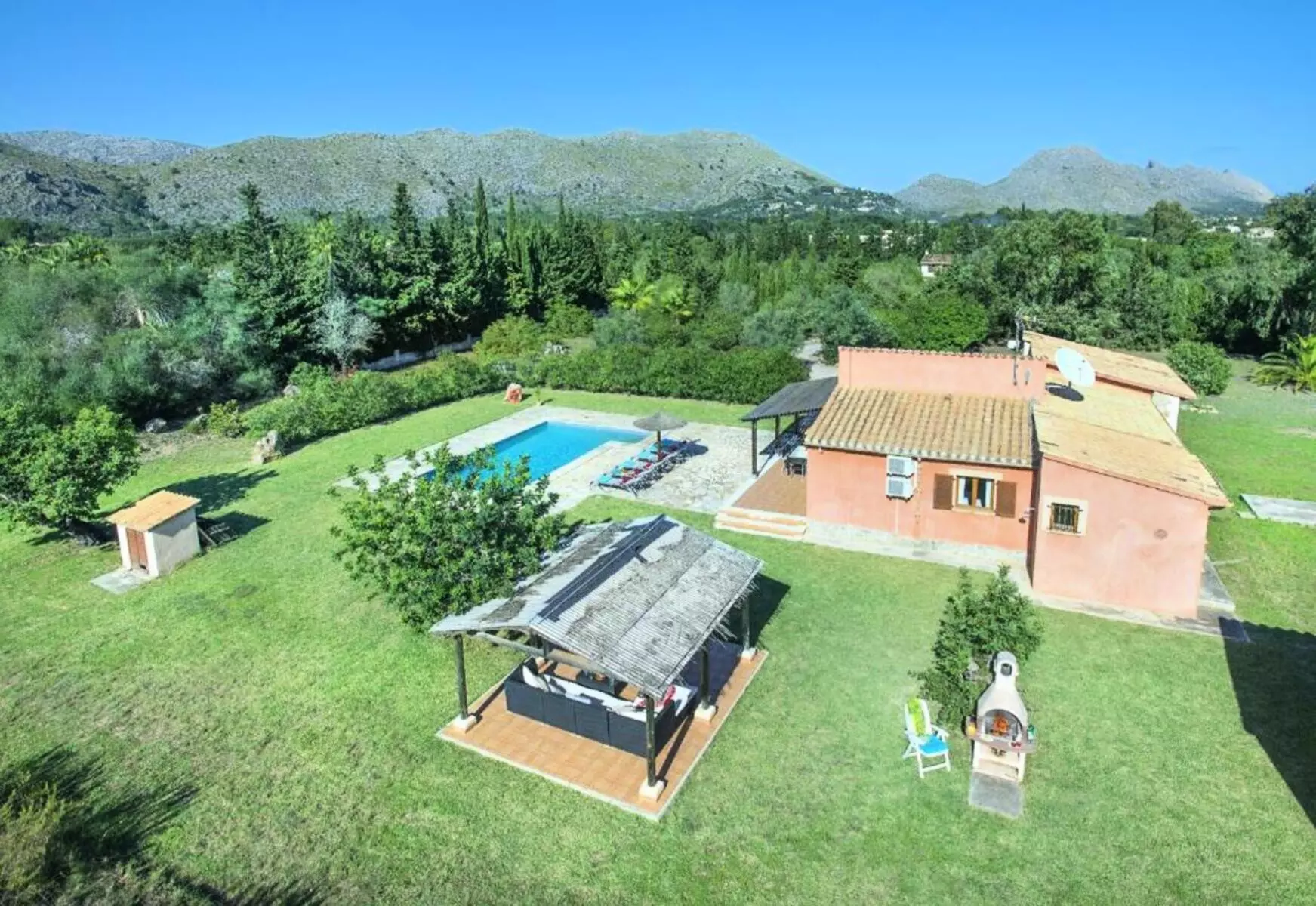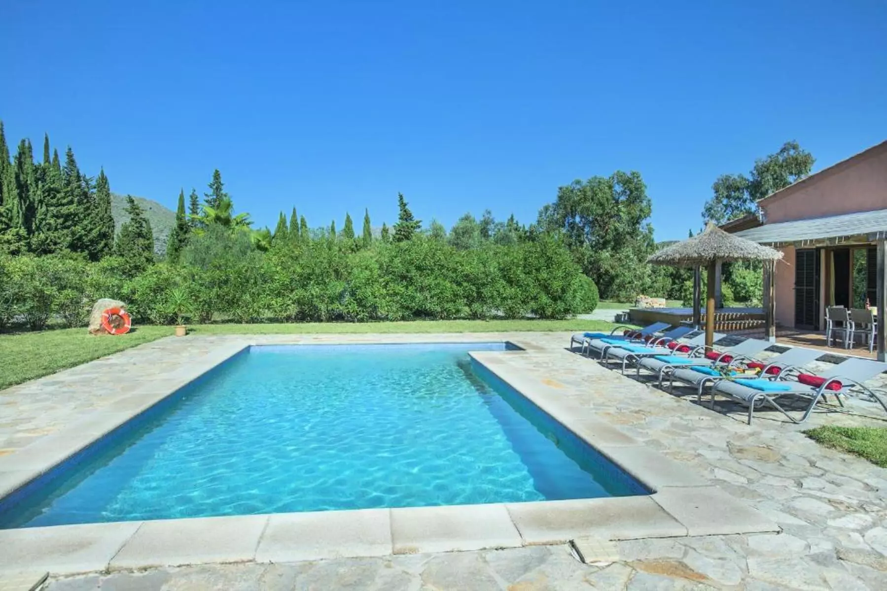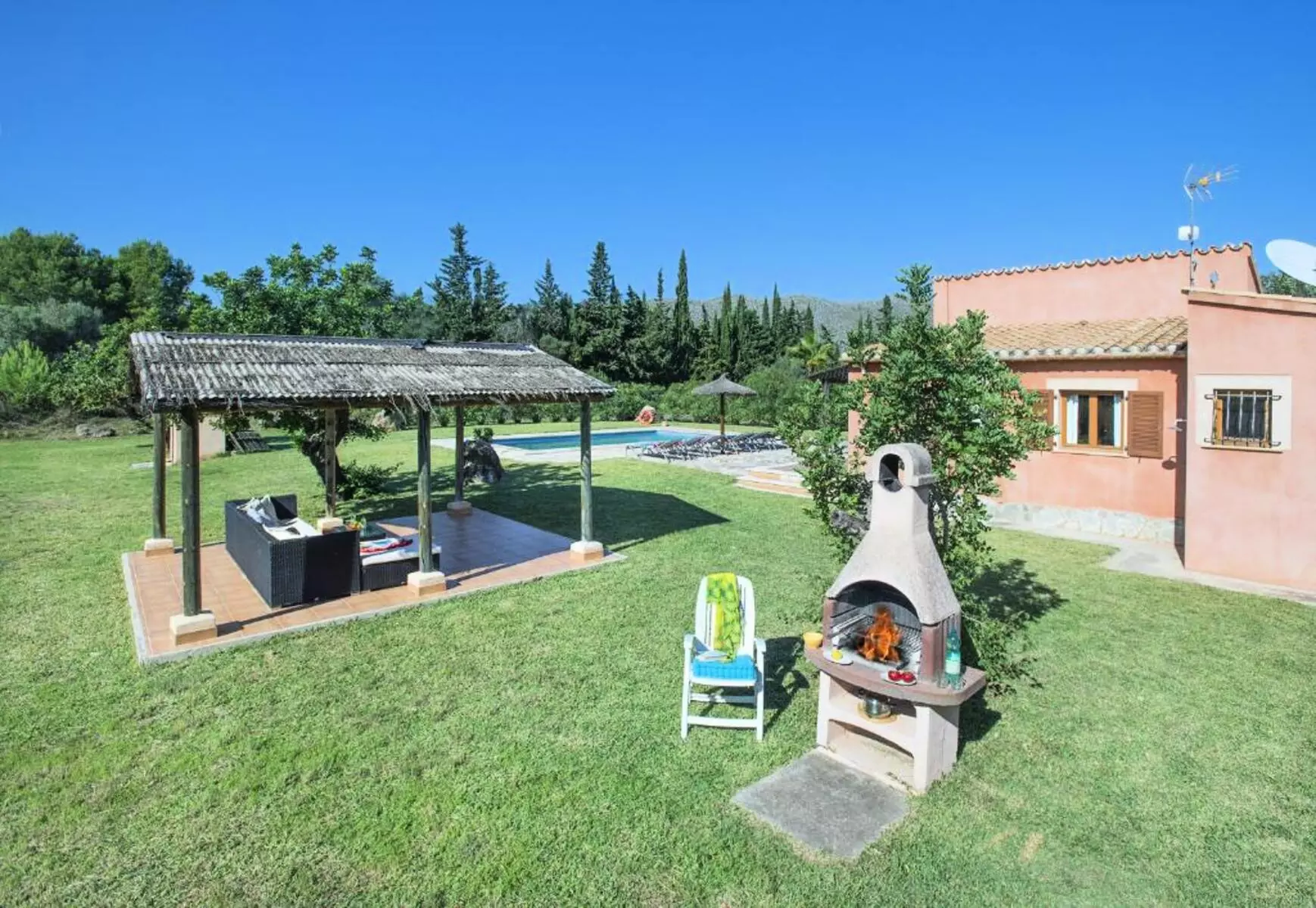 The expansive lawned garden, chill-out area, and pool surrounded by nature offer a wonderful space to unwind. The covered terrace, furnished with sofas and an outdoor dining area, along with the gazebo with a barbecue, invites you to enjoy long al fresco meals, sunsets, and tranquil evenings under the stars. It's the perfect setting for families or groups looking for a villa with a pool in Mallorca where they can create unforgettable memories.