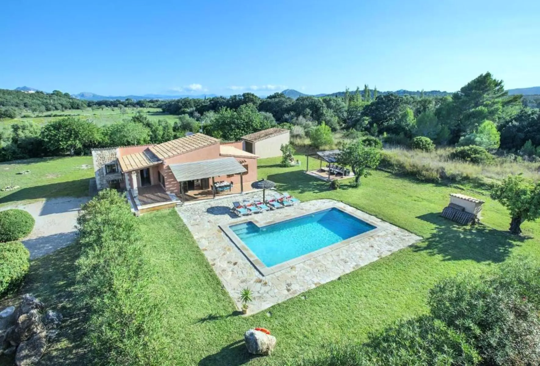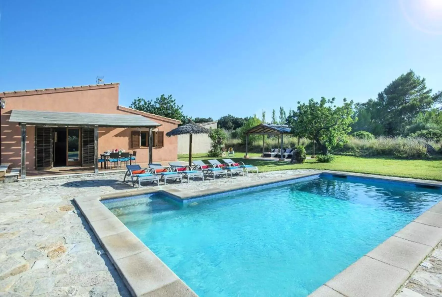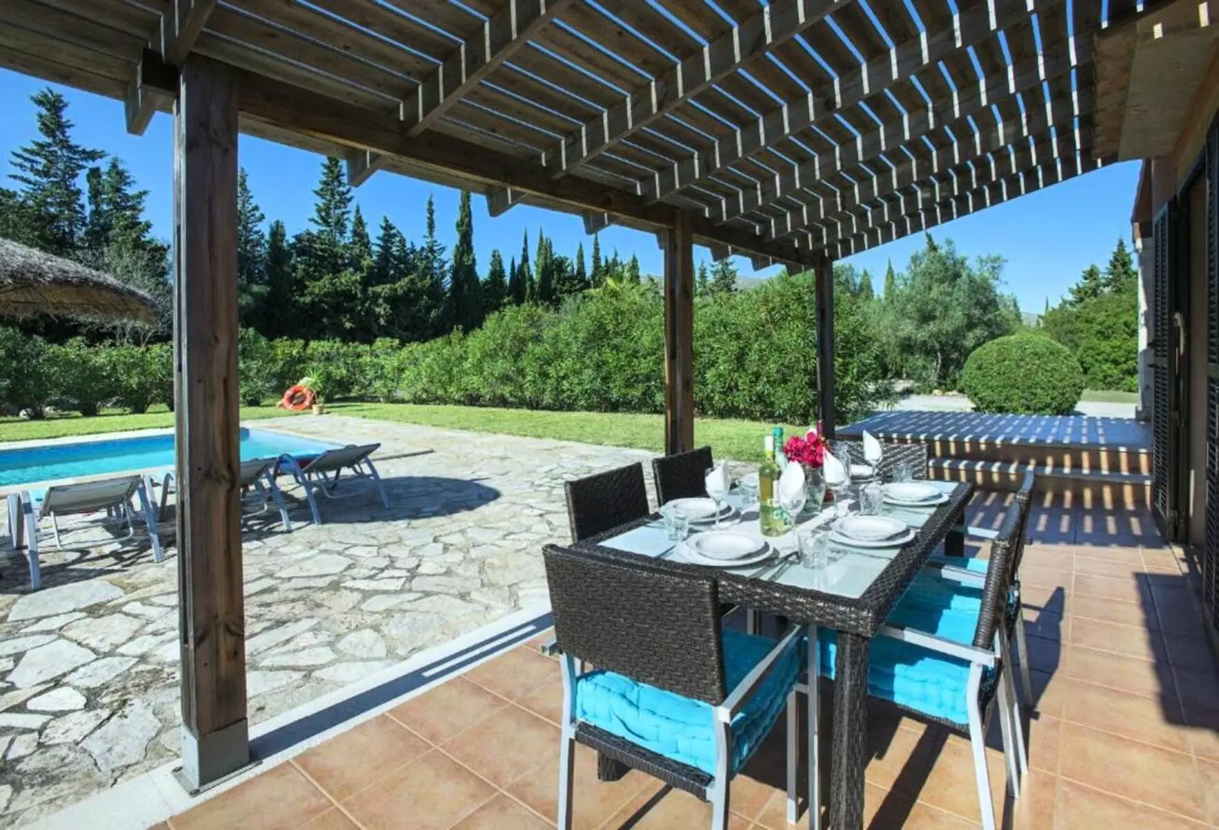 The expansive lawned garden, chill-out area, and pool surrounded by nature offer a wonderful space to unwind. The covered terrace, furnished with sofas and an outdoor dining area, along with the gazebo with a barbecue, invites you to enjoy long al fresco meals, sunsets, and tranquil evenings under the stars. It's the perfect setting for families or groups looking for a villa with a pool in Mallorca where they can create unforgettable memories.