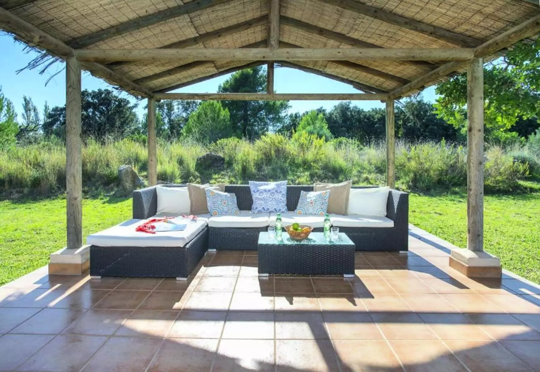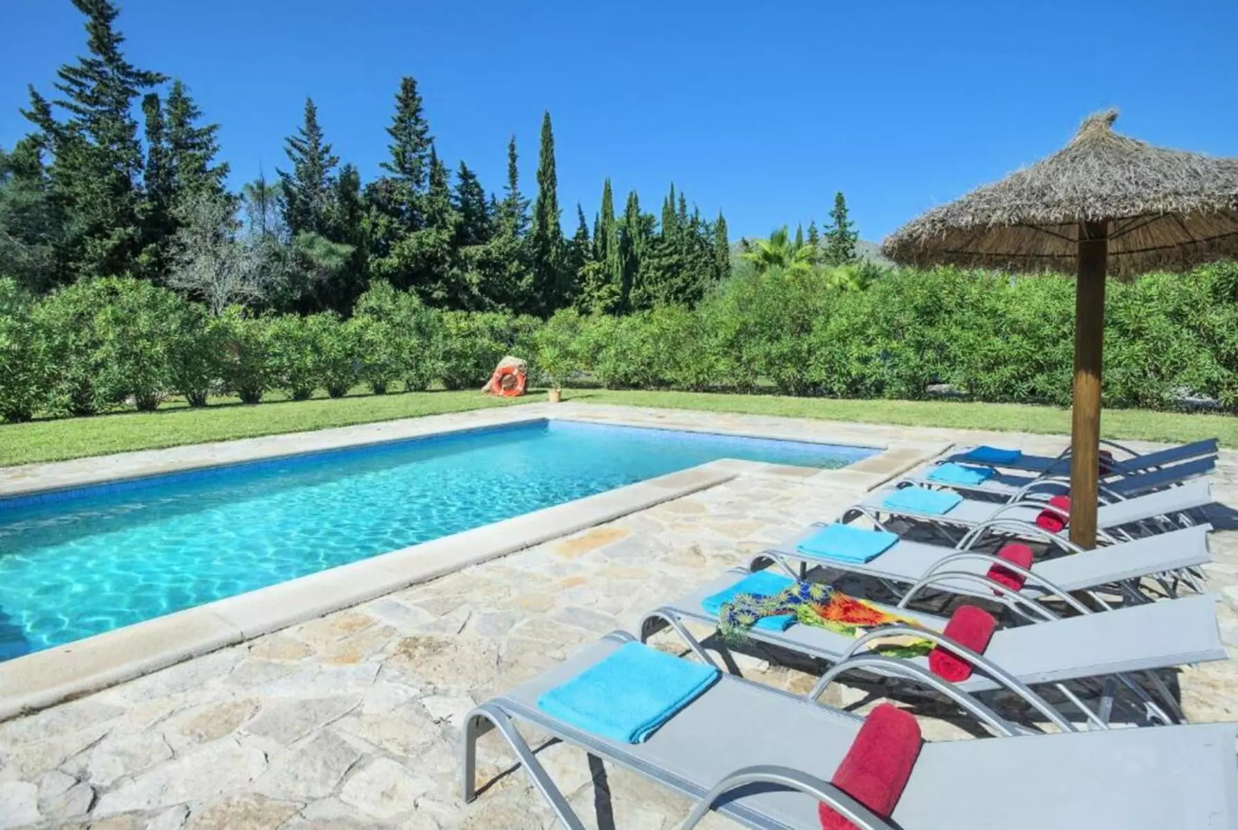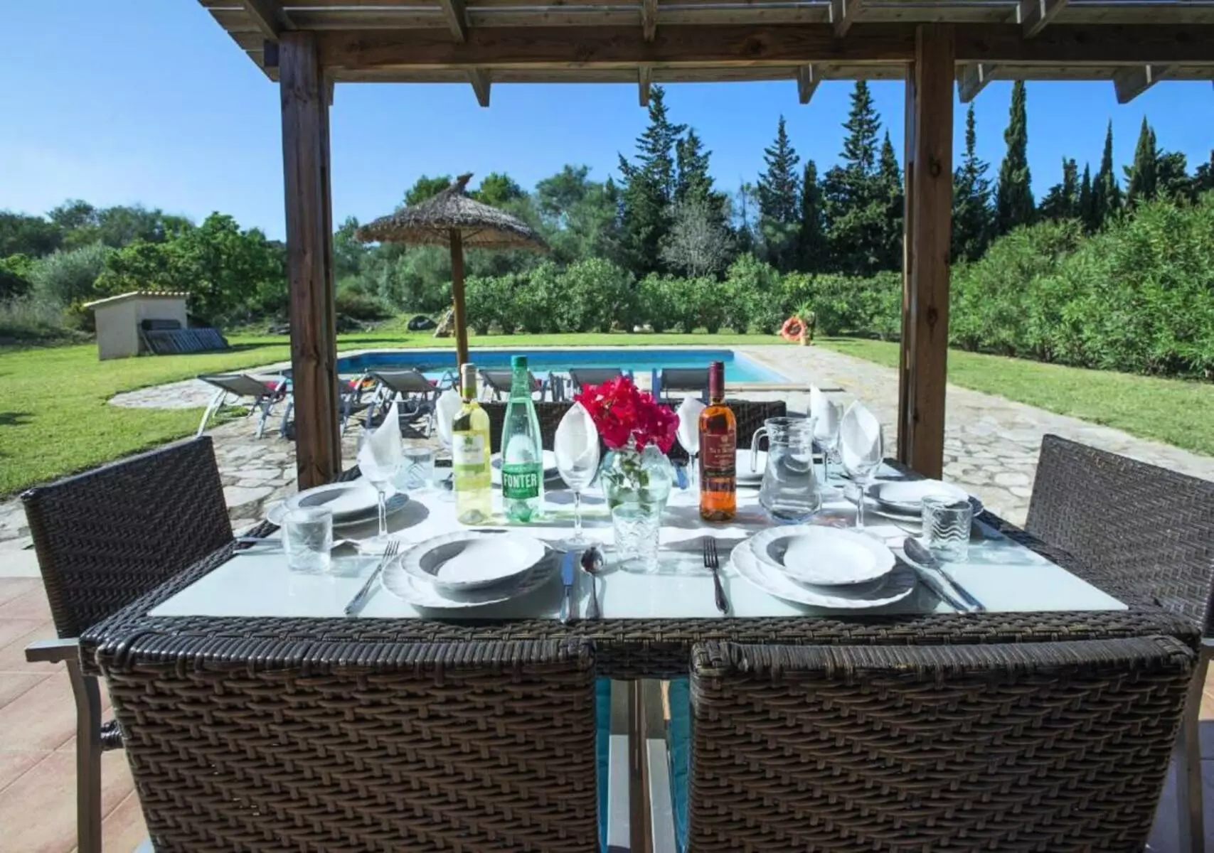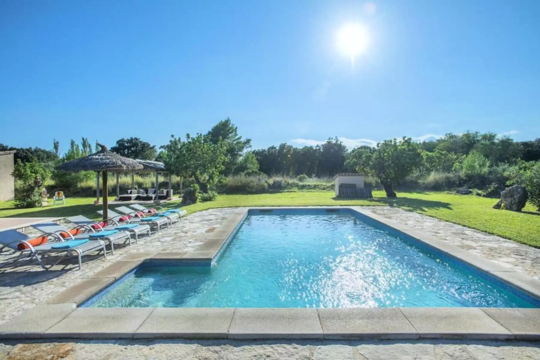 The expansive lawned garden, chill-out area, and pool surrounded by nature offer a wonderful space to unwind. The covered terrace, furnished with sofas and an outdoor dining area, along with the gazebo with a barbecue, invites you to enjoy long al fresco meals, sunsets, and tranquil evenings under the stars. It's the perfect setting for families or groups looking for a villa with a pool in Mallorca where they can create unforgettable memories.