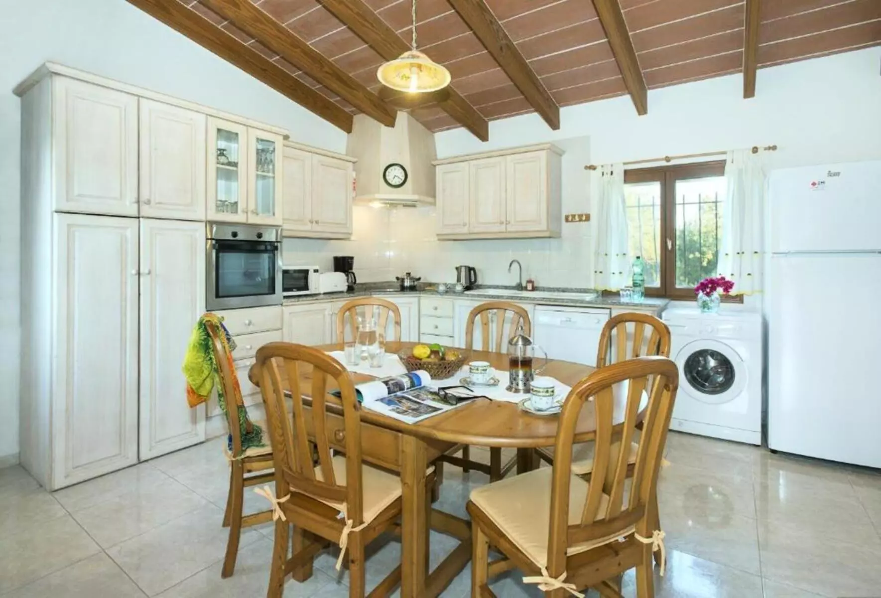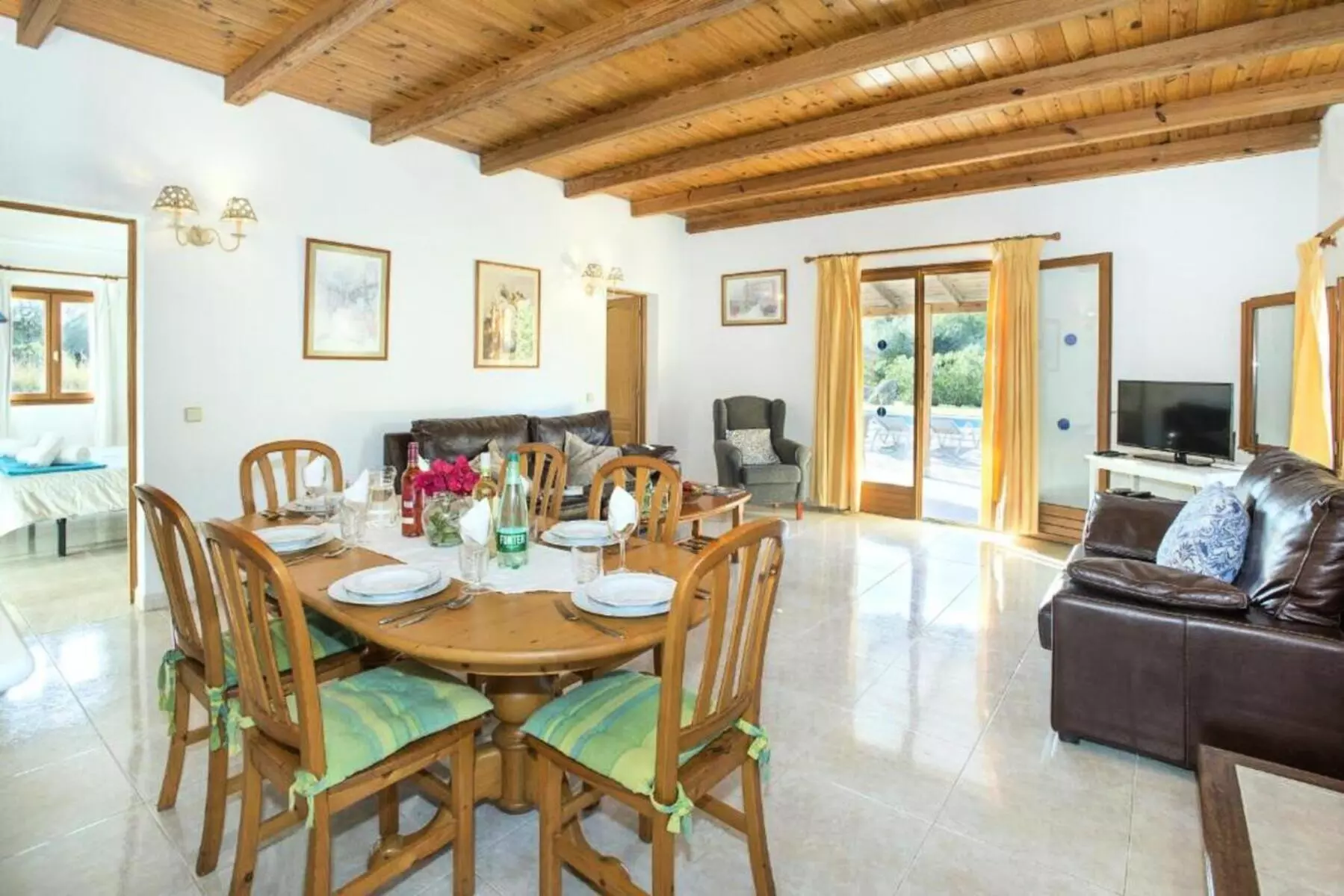 The open-plan living and dining room is distinguished by its natural light and relaxed atmosphere, featuring comfortable sofas, a Smart TV, and a large dining table. The fully equipped and highly practical kitchen includes a breakfast table, ideal for starting the day in a calm and welcoming setting.
