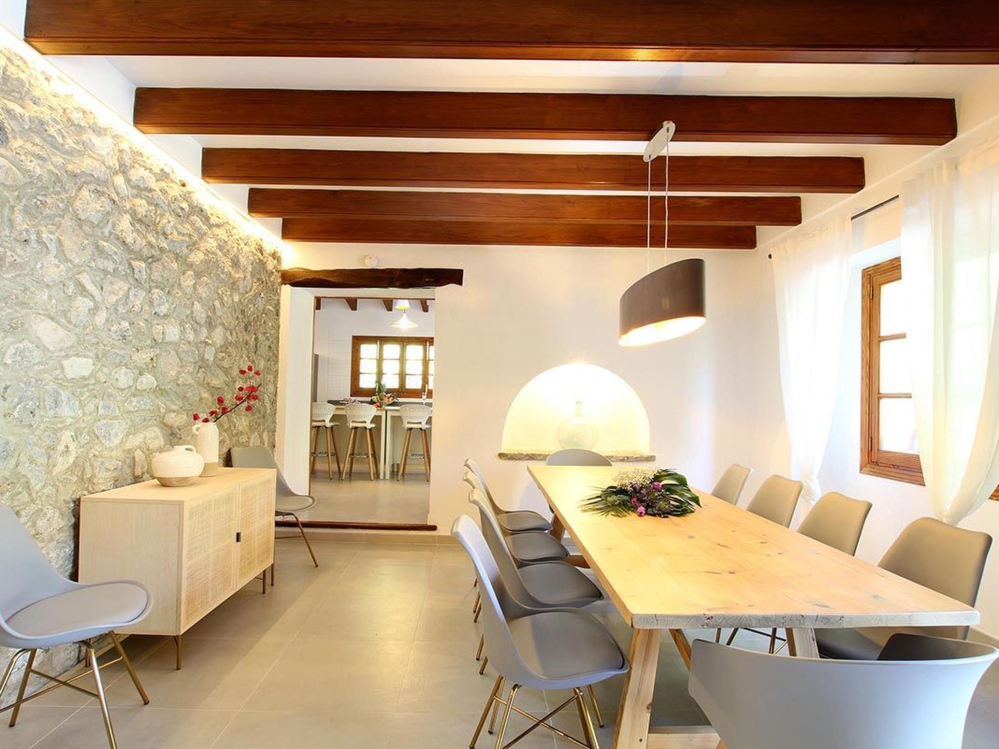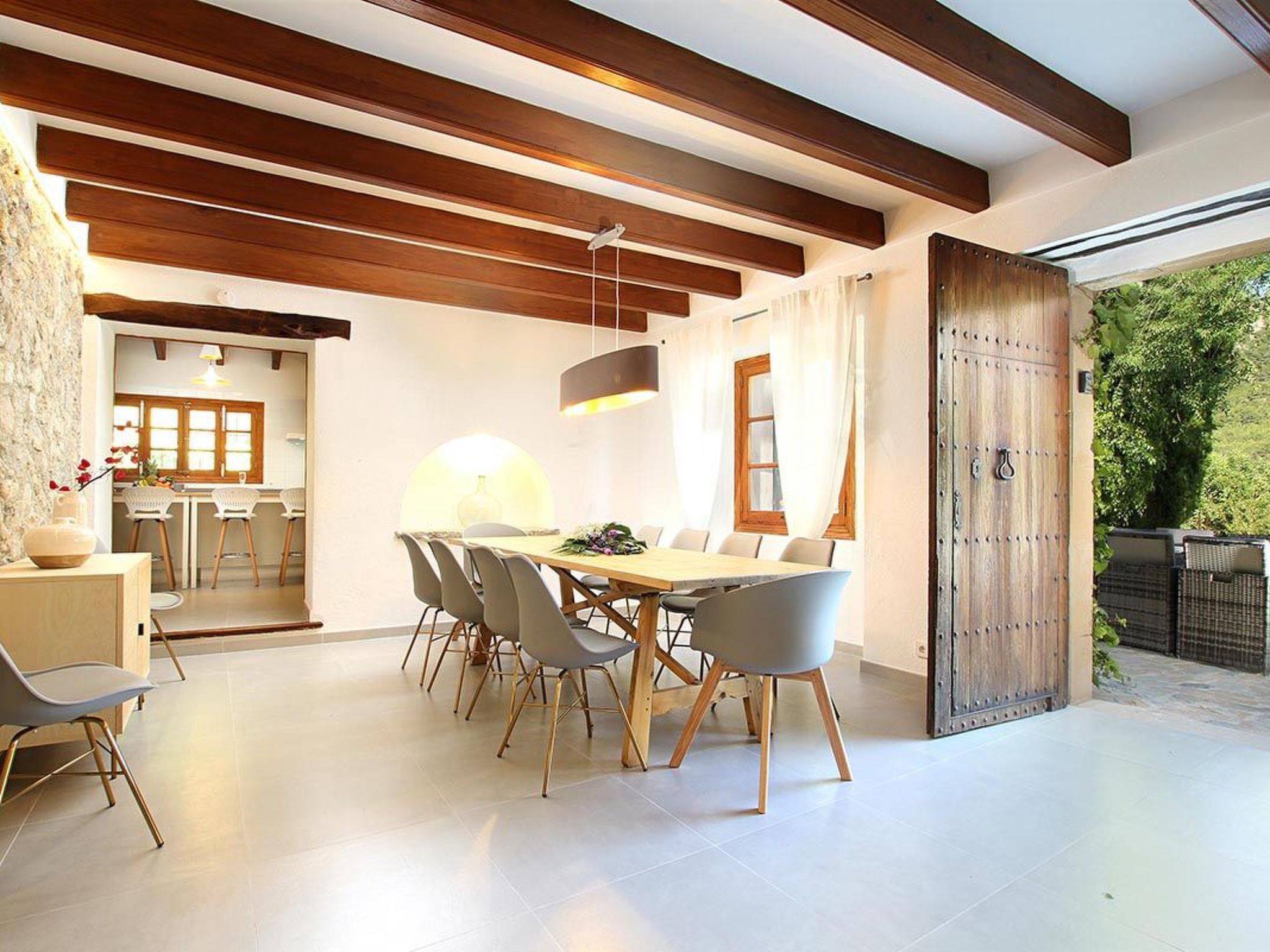 The main entrance of the house gives access to a spacious hallway, equipped with a table and chairs for its function as an indoor dining room. This leads to a large fully equipped kitchen, which still conserves the old fireplace (currently disabled) typical of the old Mallorcan houses.