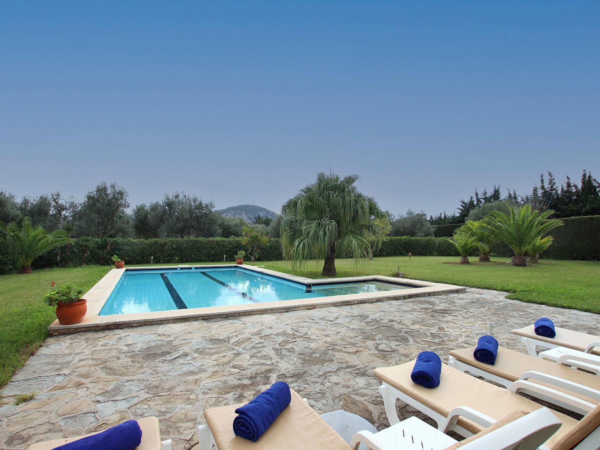The swimming pool is surrounded by a nice and large garden with lawn and a small solarium area with sun loungers.