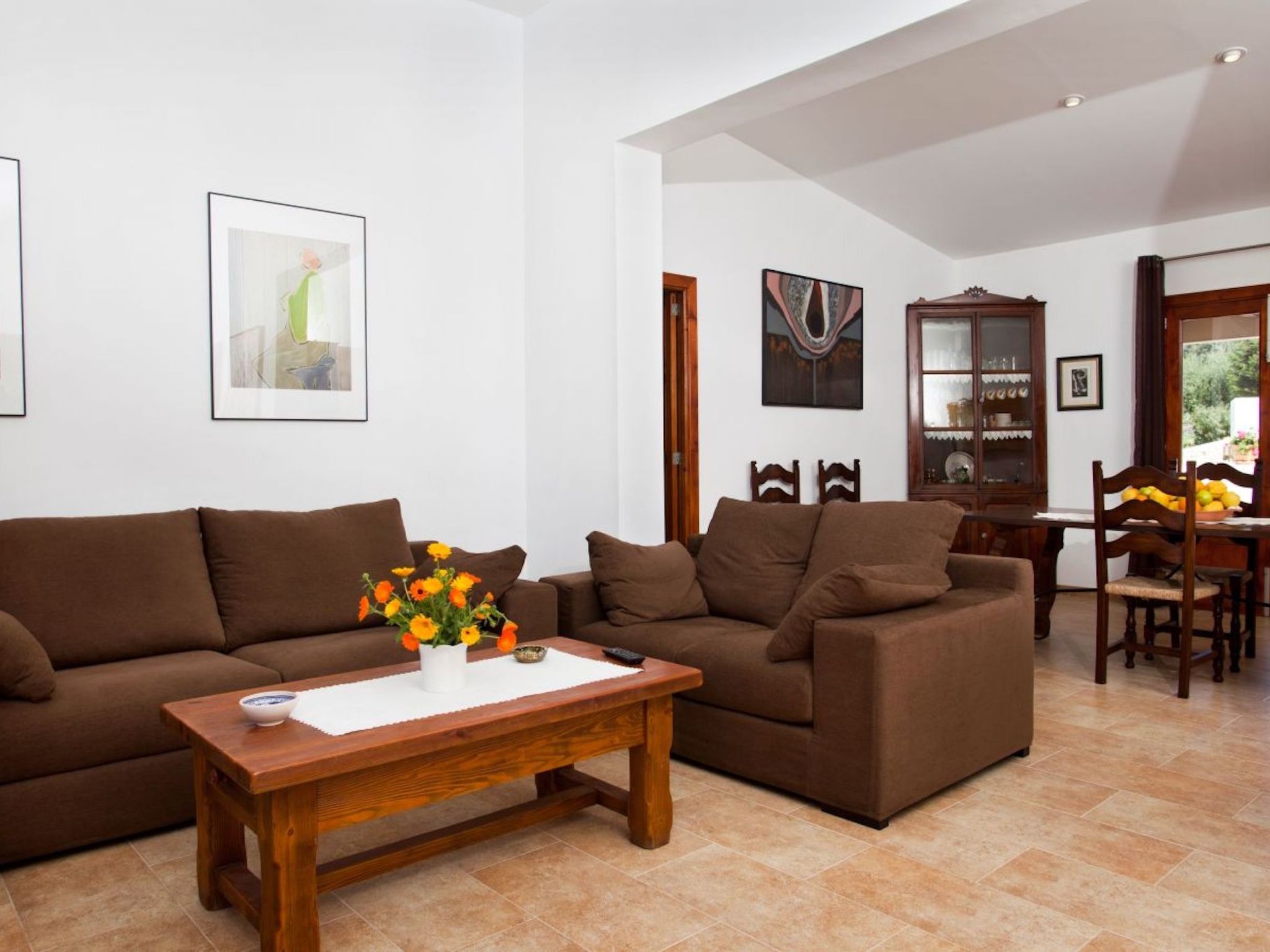 Villa can Tirana is a one-storey house that has been recently restored. It is situated in a totally peaceful enclave in the Majorcan countryside. The house is accessed through a private, unpaved road. The front door gives direct access to the living room, which is equipped with two comfortable sofas, a coffee table and satellite TV. The dining room is separate from the living room and has enough table and chairs for six people. The large and beautiful kitchen is modern in style, and is fully equipped with dishwasher, fridge/freezer, microwave, ceramic hob, electric oven and other utensils necessary for this type of tourist accommodation.