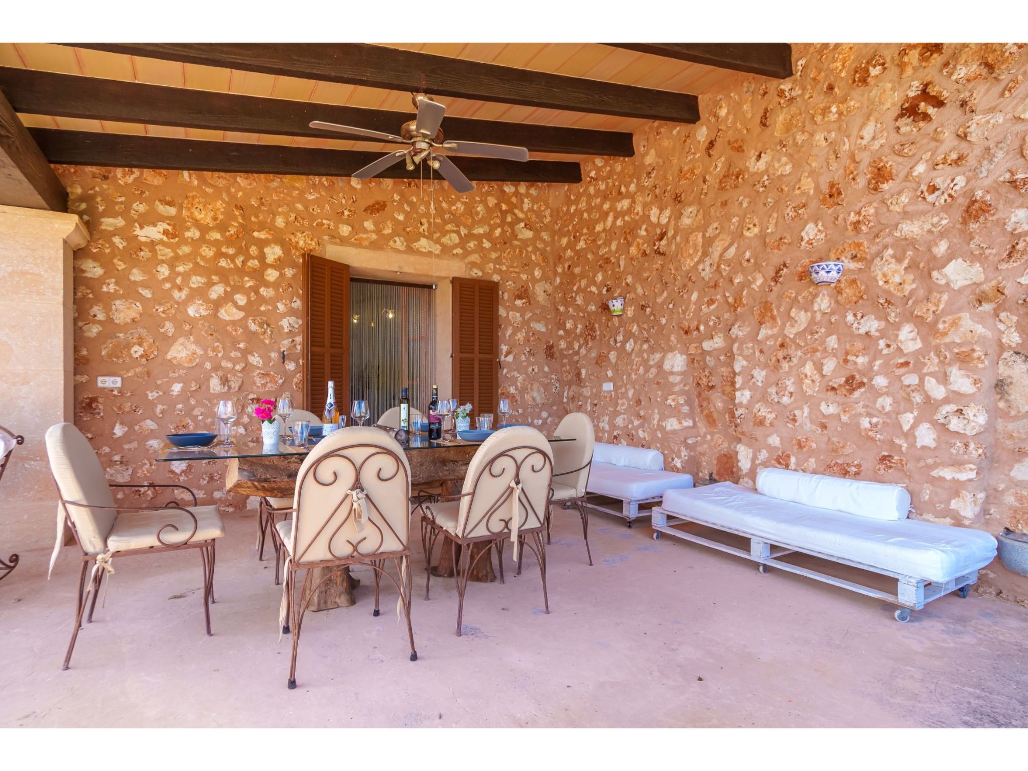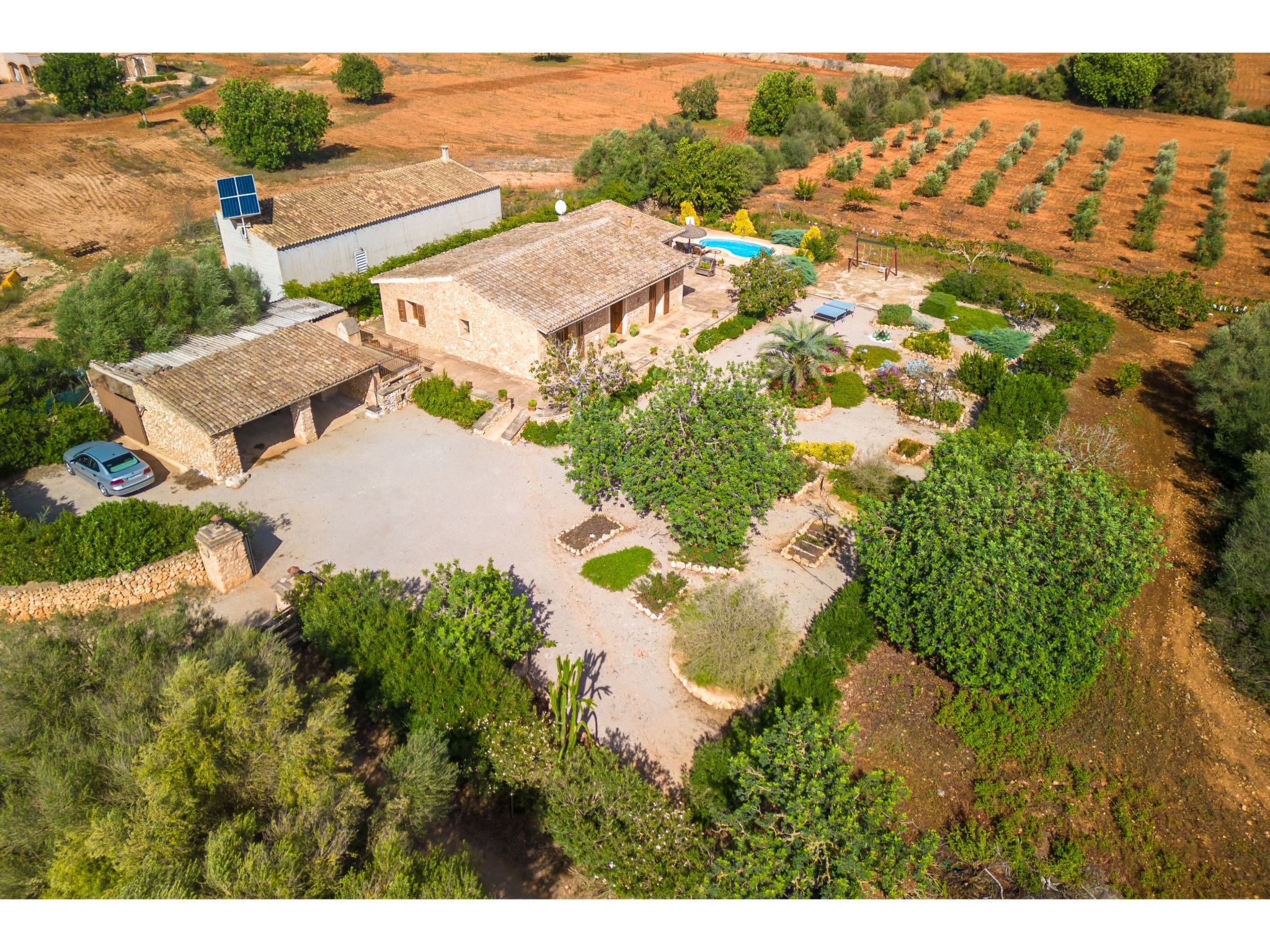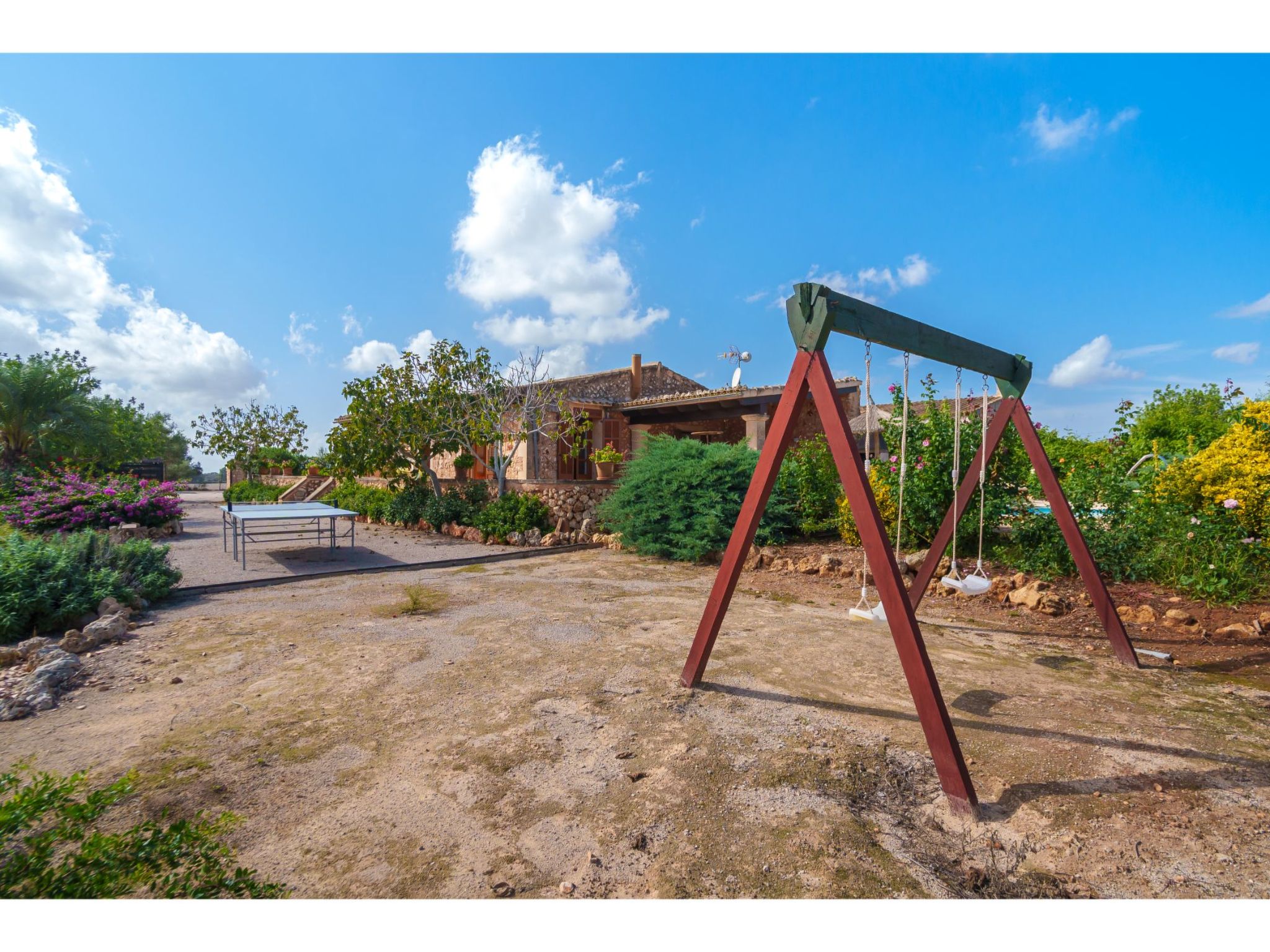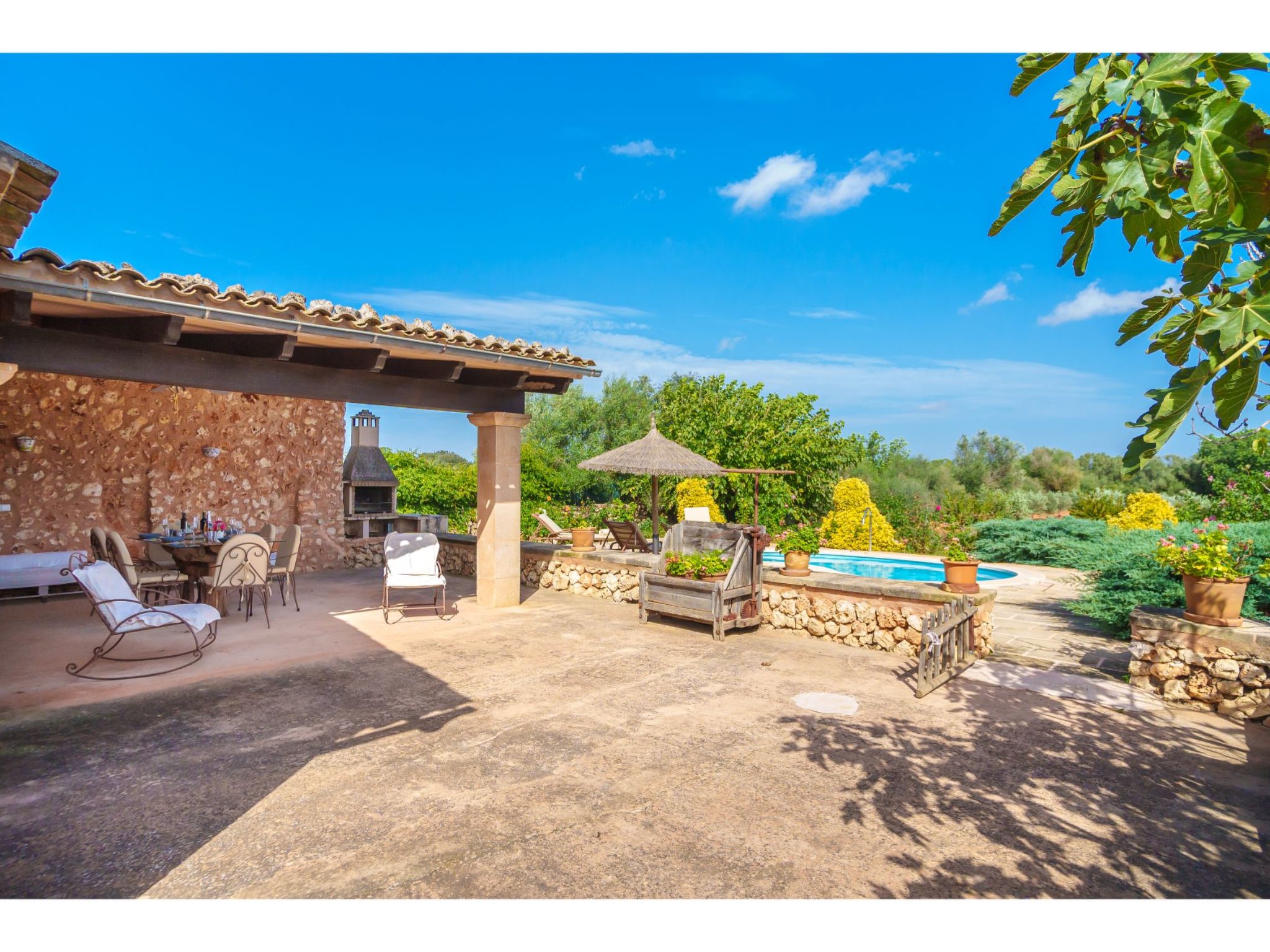 Porreres: Cosy, rustic farm estate "Los Geranios", surrounded by trees, meadows and fields. Outside the resort, 6 km from the centre of Porreres, in a quiet position, traffic calmed area, in a cul-de-sac. Private: natural state property, beautiful, well-kept garden, orchard, lawn for sunbathing, swimming pool kidney shaped (6 x 3 m, depth 60 - 150 cm, seasonal availability: 01.Mar. - 31.Oct.). Outdoor shower, arbour, pergola, terrace, garden furniture, barbecue. In the house: internet access, WiFi, air conditioning, washing machine. Parking on the premises. Bus stop "Porreras" 7 km. Please note: car recommended. Suitable for families, suitable for seniors baby equipment on request (included). Object suitable for 6 adults. The owner does not accept any youth groups. Loading and unloading of baggage is possible at the holiday house. Airfield 40 km from the property.