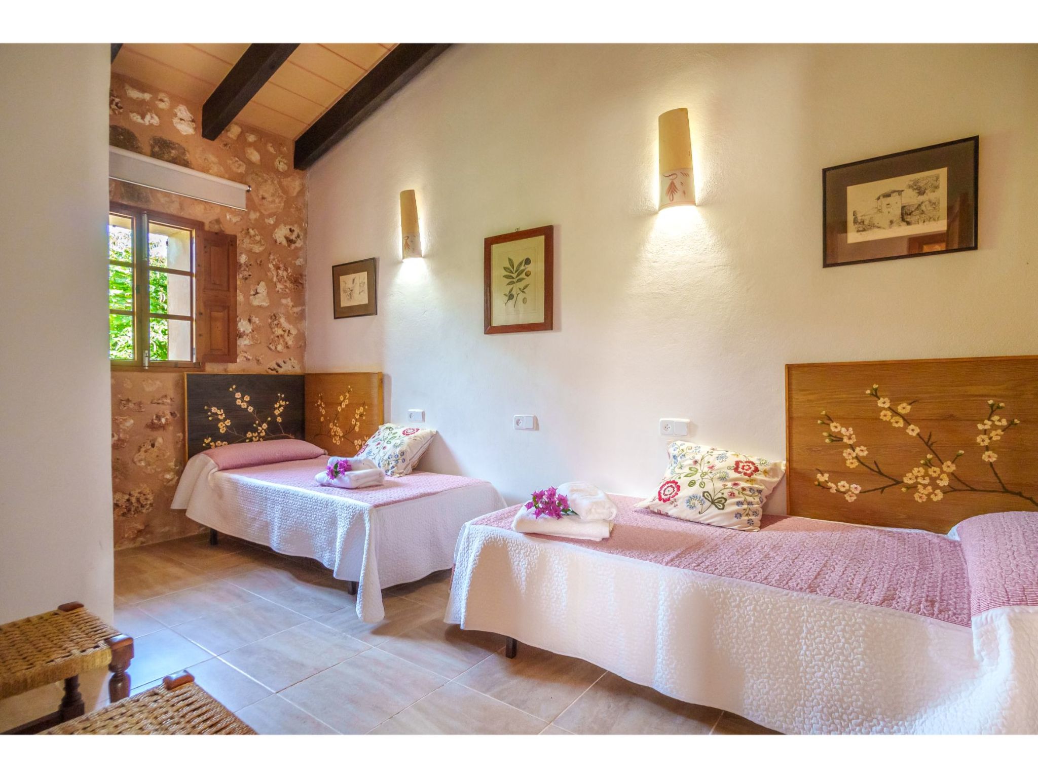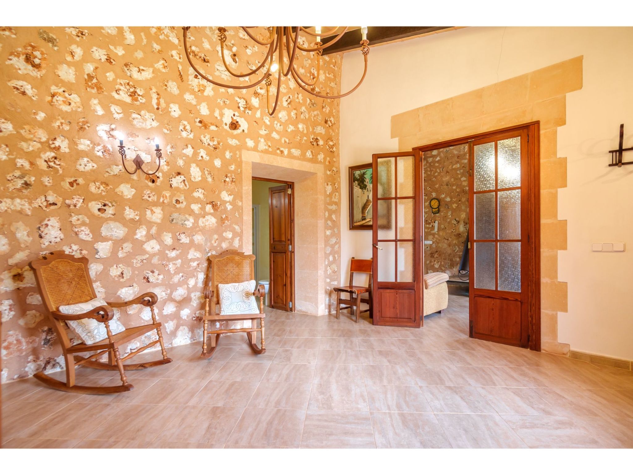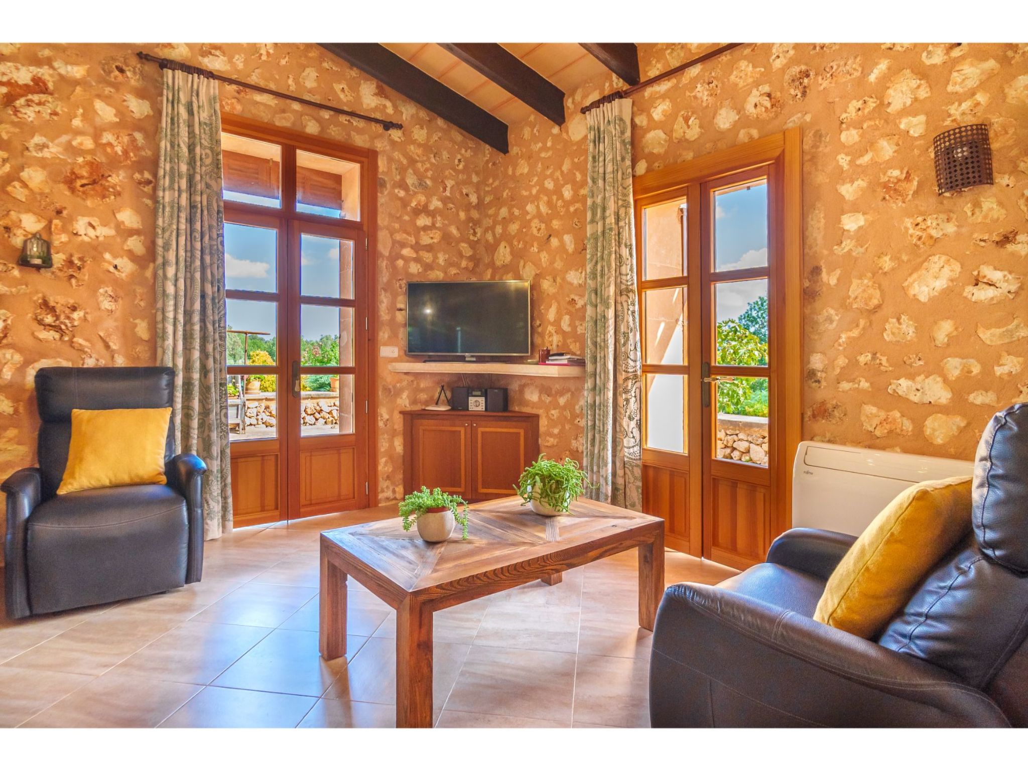 Porreres: Cosy, rustic farm estate "Los Geranios", surrounded by trees, meadows and fields. Outside the resort, 6 km from the centre of Porreres, in a quiet position, traffic calmed area, in a cul-de-sac. Private: natural state property, beautiful, well-kept garden, orchard, lawn for sunbathing, swimming pool kidney shaped (6 x 3 m, depth 60 - 150 cm, seasonal availability: 01.Mar. - 31.Oct.). Outdoor shower, arbour, pergola, terrace, garden furniture, barbecue. In the house: internet access, WiFi, air conditioning, washing machine. Parking on the premises. Bus stop "Porreras" 7 km. Please note: car recommended. Suitable for families, suitable for seniors baby equipment on request (included). Object suitable for 6 adults. The owner does not accept any youth groups. Loading and unloading of baggage is possible at the holiday house. Airfield 40 km from the property.