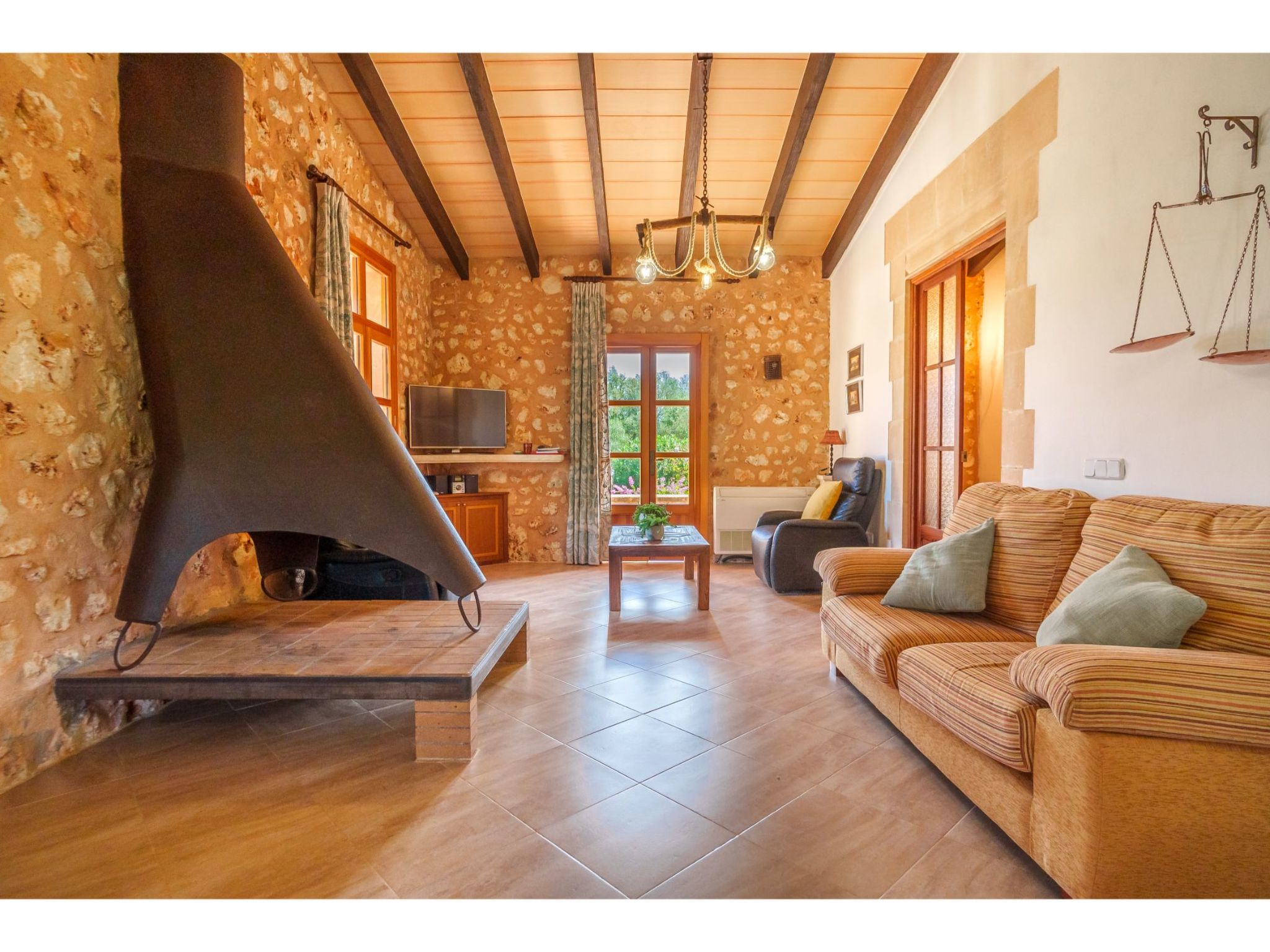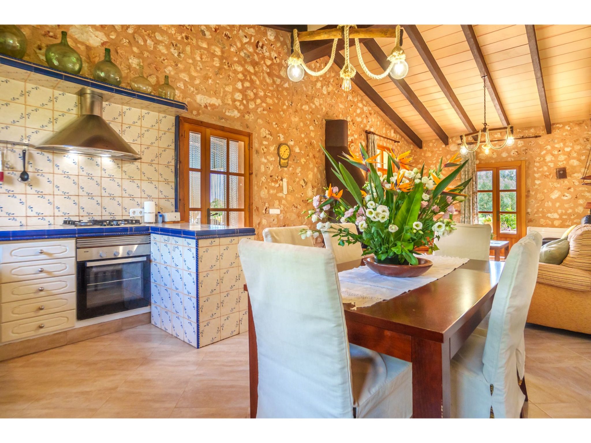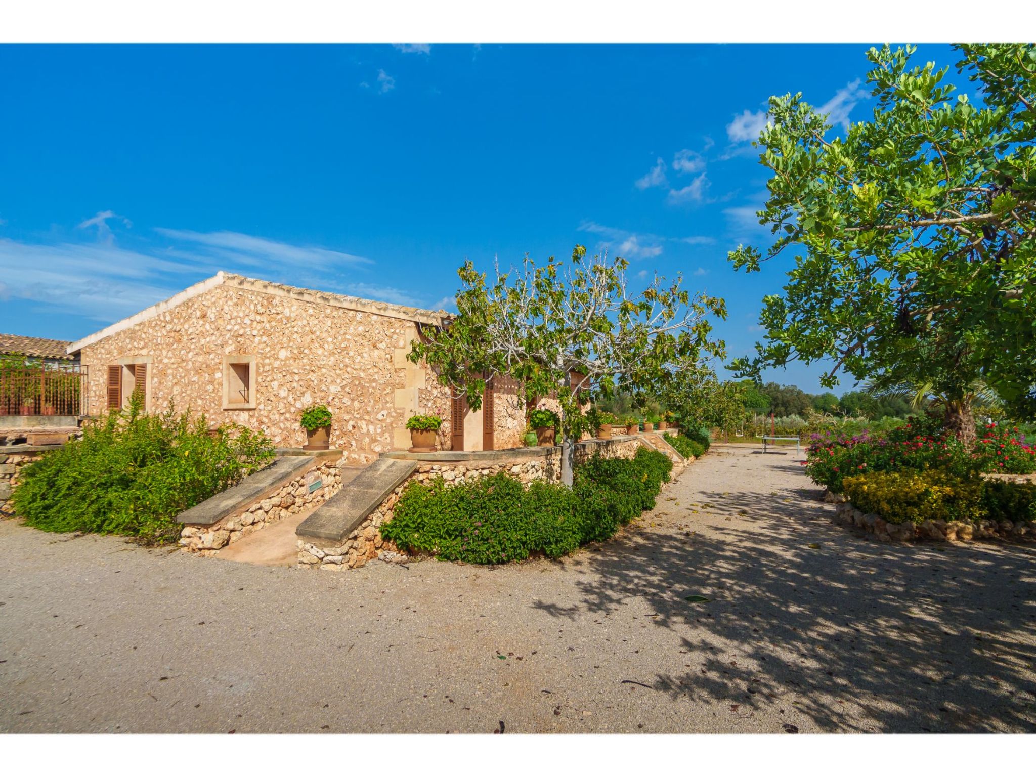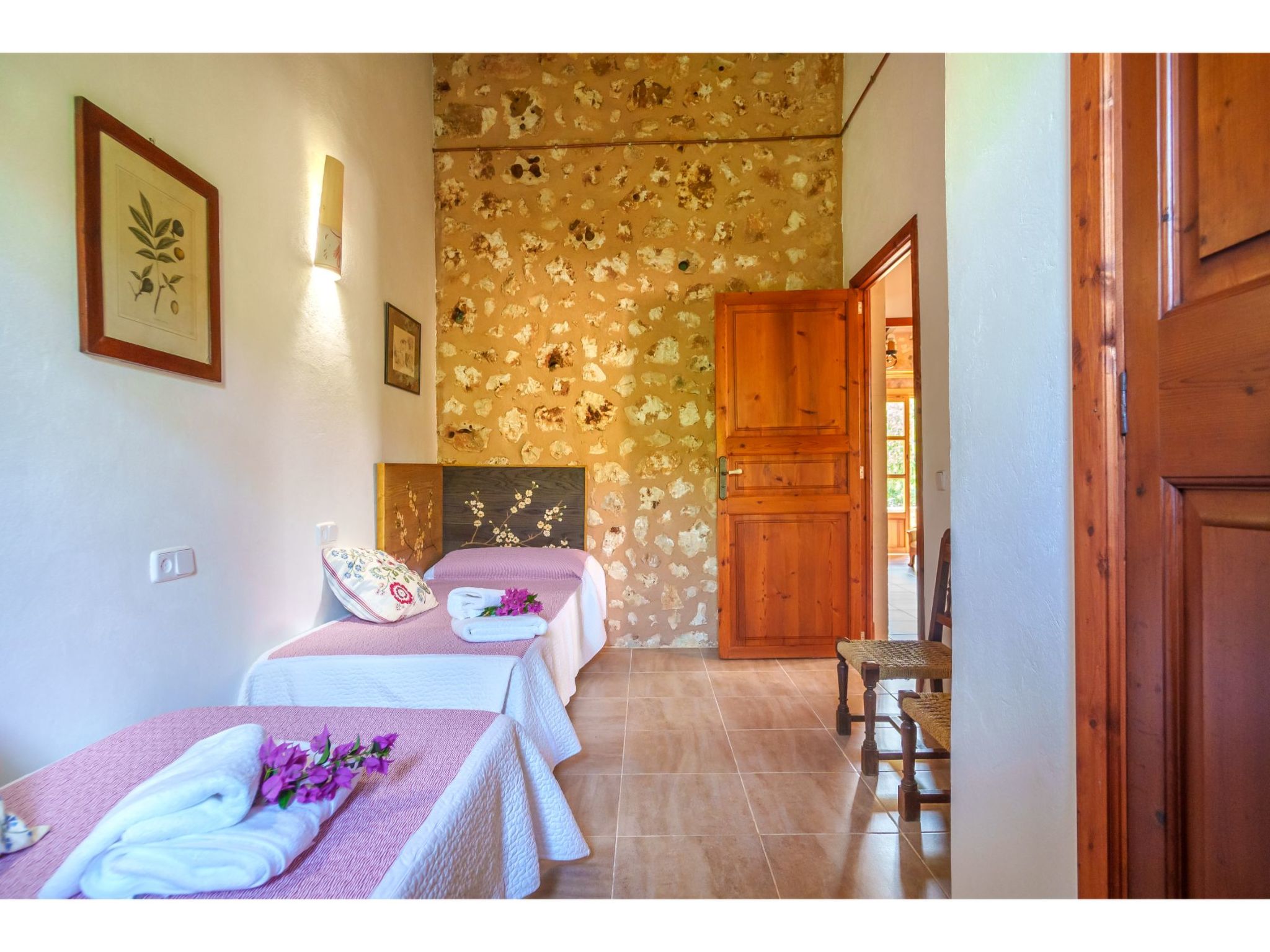 Porreres: Cosy, rustic farm estate "Los Geranios", surrounded by trees, meadows and fields. Outside the resort, 6 km from the centre of Porreres, in a quiet position, traffic calmed area, in a cul-de-sac. Private: natural state property, beautiful, well-kept garden, orchard, lawn for sunbathing, swimming pool kidney shaped (6 x 3 m, depth 60 - 150 cm, seasonal availability: 01.Mar. - 31.Oct.). Outdoor shower, arbour, pergola, terrace, garden furniture, barbecue. In the house: internet access, WiFi, air conditioning, washing machine. Parking on the premises. Bus stop "Porreras" 7 km. Please note: car recommended. Suitable for families, suitable for seniors baby equipment on request (included). Object suitable for 6 adults. The owner does not accept any youth groups. Loading and unloading of baggage is possible at the holiday house. Airfield 40 km from the property.