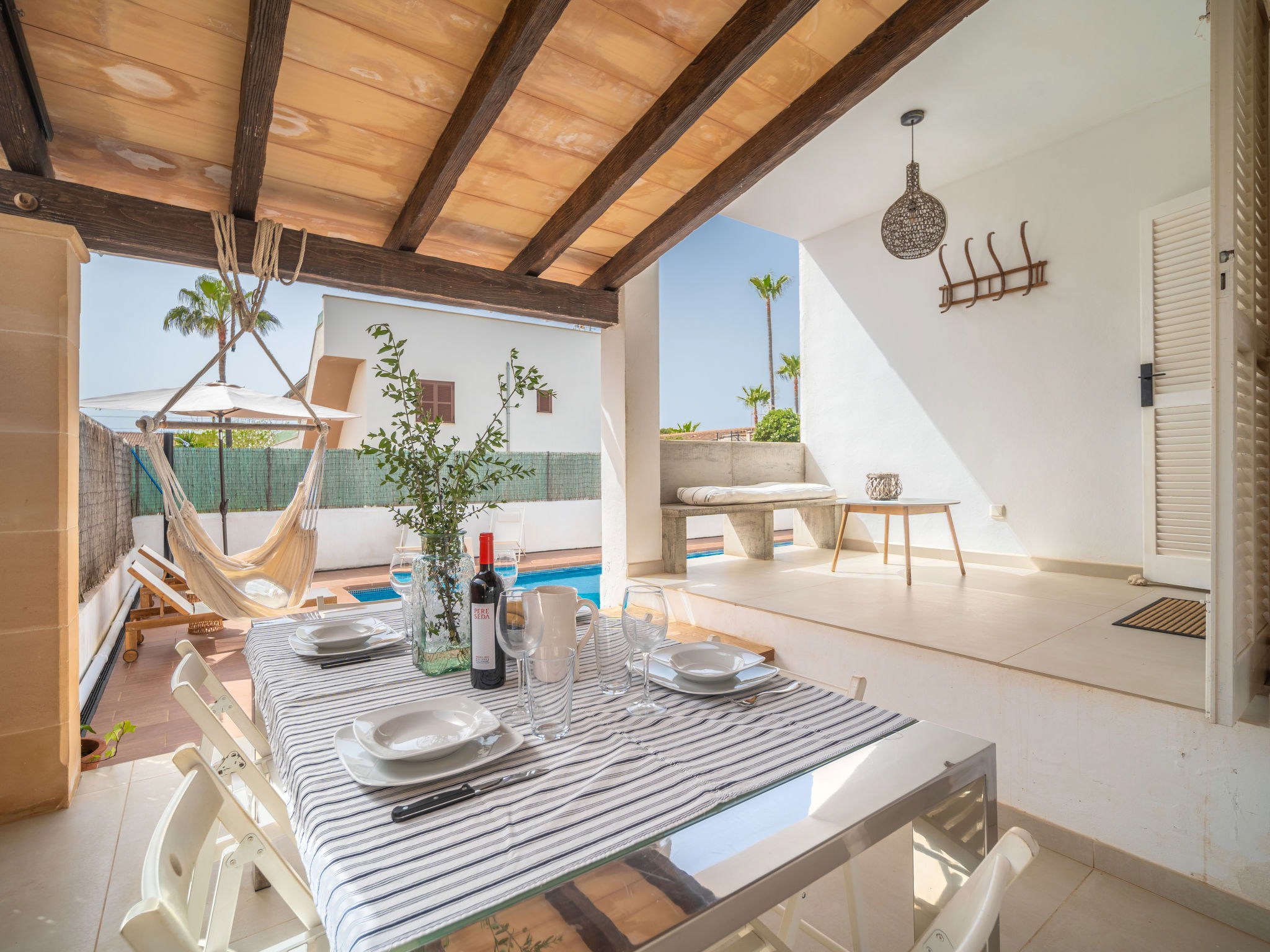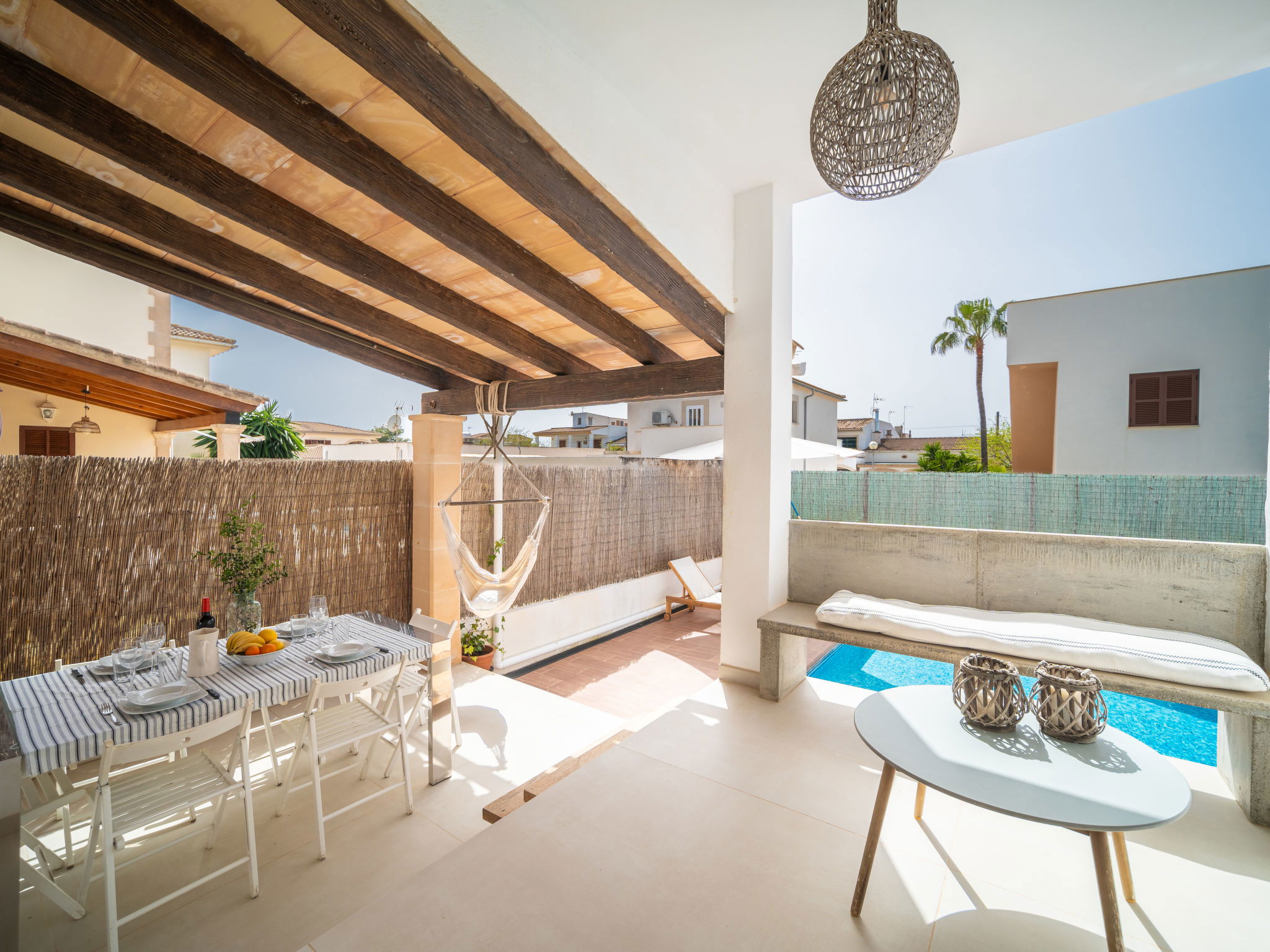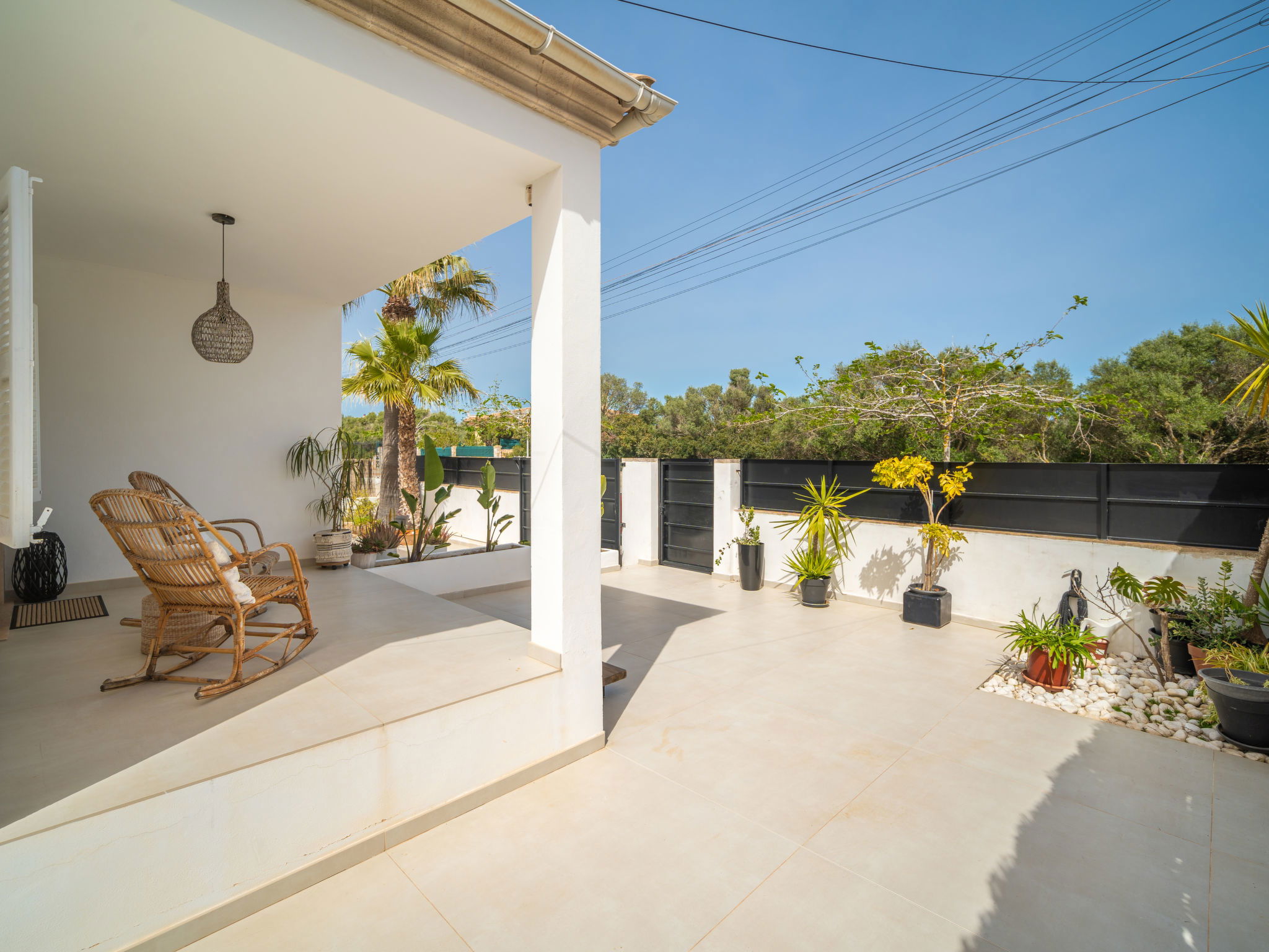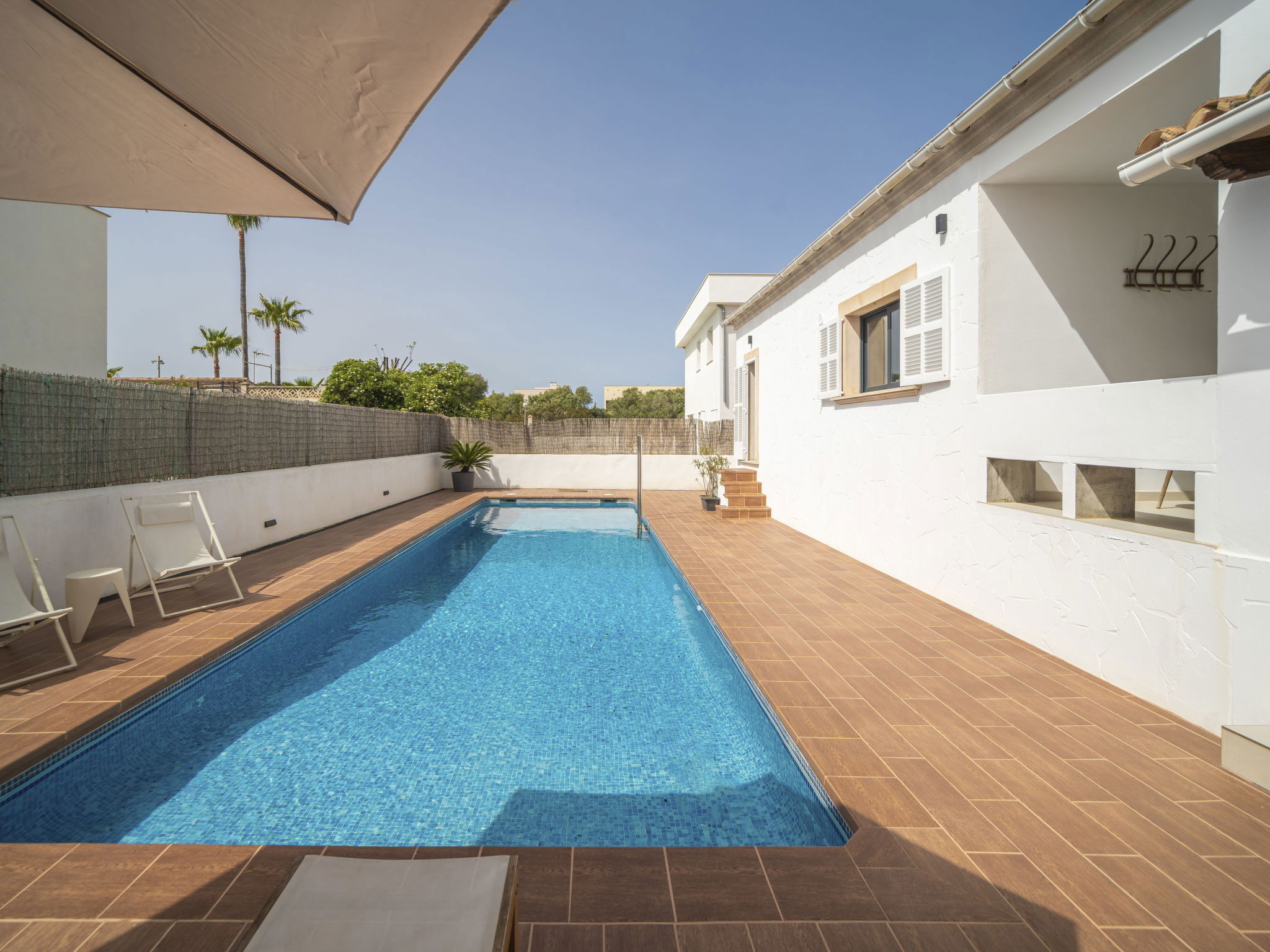 Son Bieló 12 km from Campos: Large, cosy, comfortable single-family house "Copinyes". In a central position, 1 km from the edge of the forest, 100 m from the sea, 350 m from the beach. Private: swimming pool angular (9 x 4 m, seasonal availability: 01.Mar. - 31.Oct.). WC in the pool area, outdoor shower, patio, arbour, pergola, pool maintenance by the owner/gardener. In the house: WiFi, washing machine. Parking at the house. Shop 200 m, grocery, supermarket 400 m, shopping centre 250 m, restaurant, bar, bakery, café, pedestrian zone 150 m, bus stop "Campos" 7 km, railway station "Manacor" 37 km, sandy beach "Ses Covetes" 950 m. Sports harbour 150 m, marina 100 m, golf course (18 hole) 8 km, surf school, sailing school 300 m, walking paths from the house 350 m, cycle lane 400 m. Nearby attractions: Campos 12 km, Santanyi 15 km, Palma de Mallorca 40 km, Cala Pi 16 km, Colonia de Sant Jordi 20 km. Please note: car recommended. Object suitable for 6 adults. The owner does not accept any youth groups. Loading and unloading of baggage is possible at the holiday house. Motorway 6 km from the property. Main road 150 m from the property. Airfield 40 km from the property. Neighbourhood highly sensitive to noise. Quietness and good behaviour expected.