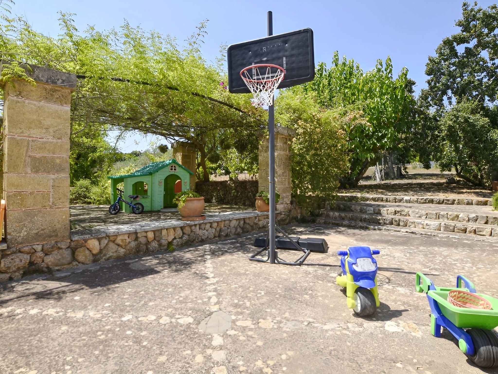Next to the pool there is a terrace with outdoor kitchen and dining table. The barbecue is a gas grill and there is also a bathroom with shower. Behind the pool area there is a covered porch with a ping pong table. On the other side of the house, there is a patio with a basketball hoop and a playhouse for the little ones.