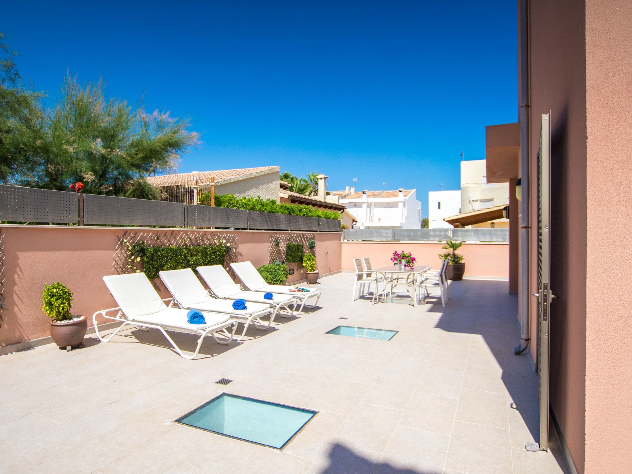 We cannot forget the splendid exterior that surrounds this villa. It has a large front and rear terrace, inviting you to live outdoors as much as you wish, whether sunbathing or enjoying an al fresco meal. These outdoor spaces are the perfect complements to the vision of une conciergerie that this property offers.