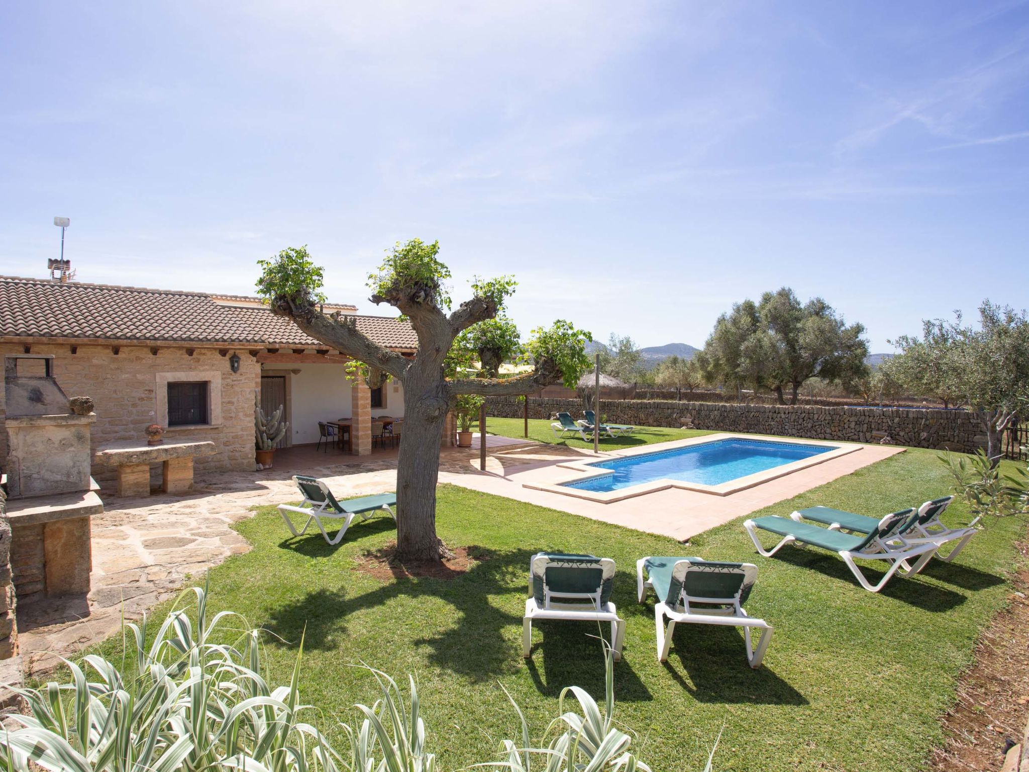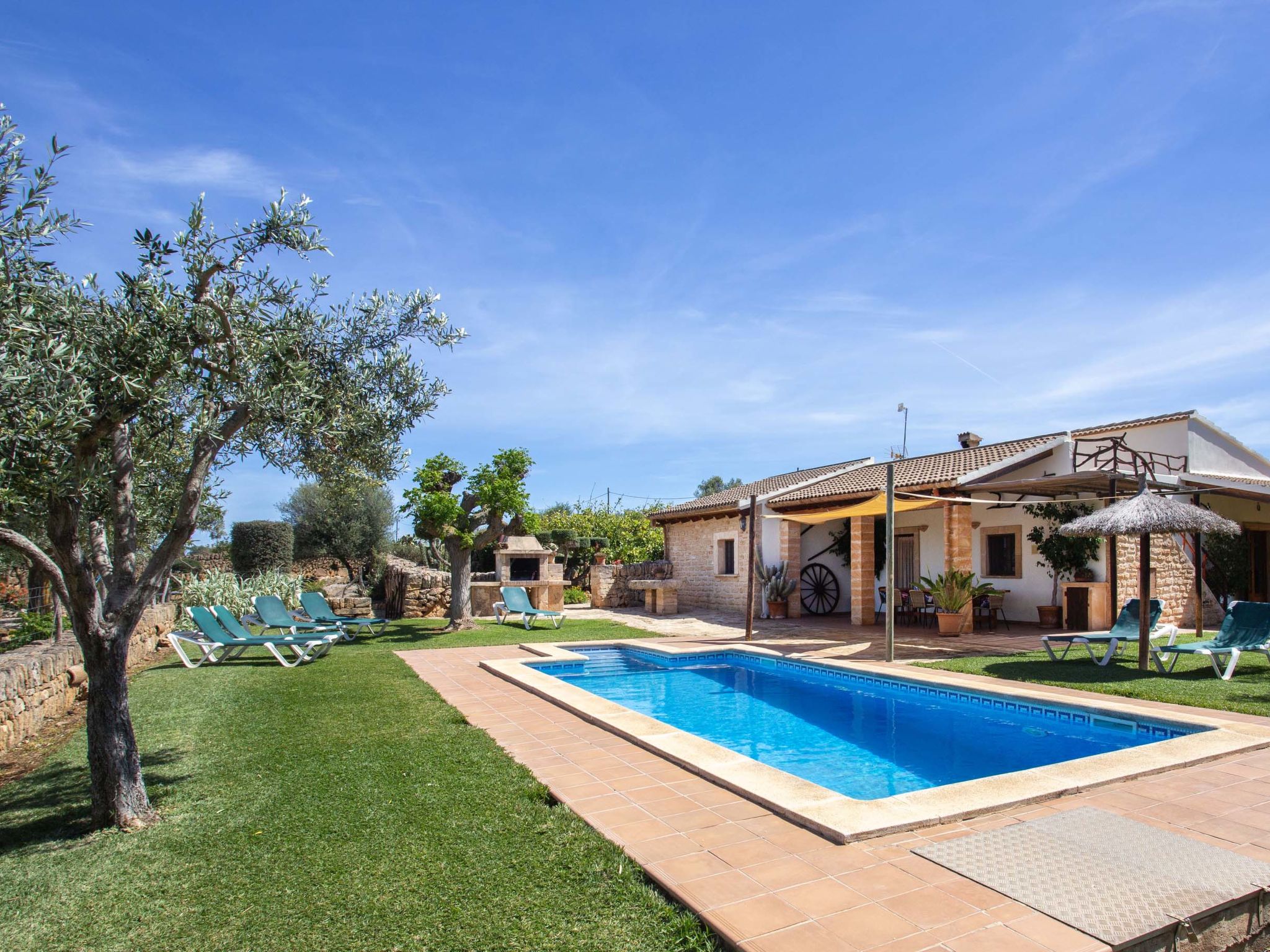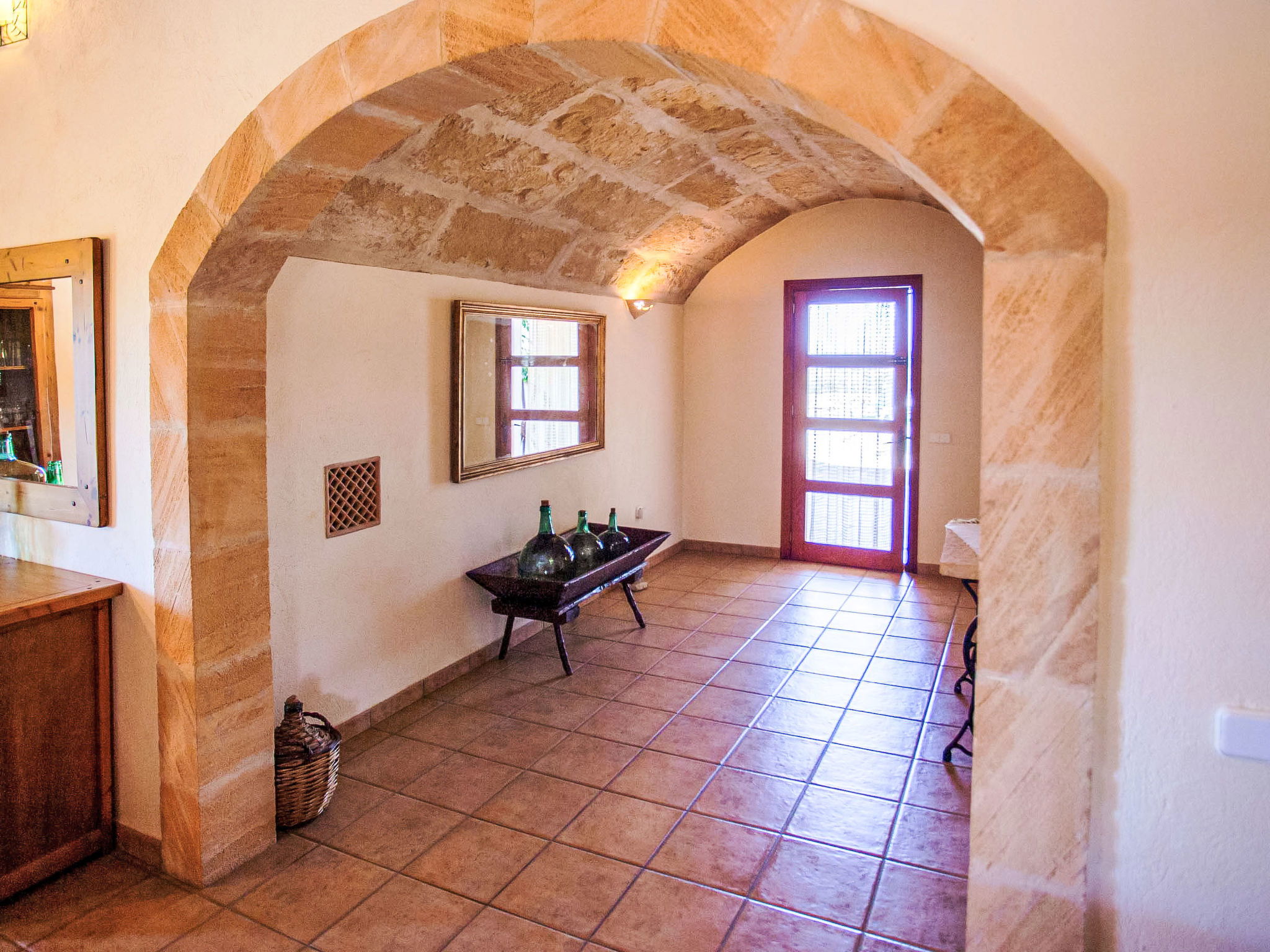 Large, comfortable farmhouse "Ca na Ines", terraced. In the resort de Son Serra de Marina, in a quiet, sunny position residential area (villas), 150 m from the edge of the forest, 5 km from the sea, 5 km from the beach. Private: natural garden, swimming pool angular (8 x 4 m, depth 140 - 220 cm, seasonal availability: 01.Mar. - 30.Nov.). Patio, arbour, pergola, garden furniture, barbecue, pool maintenance by the owner/gardener. In the house: internet access, WiFi, storage room for bicycles, air conditioning, washing machine. Parking at the house. Grocery 4.5 km, restaurant 6 km, bar 6 km, bus stop "Parada 55042 Bus stop" 5 km, ferry "Alcúdia" 20 km, sandy beach "Playa de Son Serra" 5 km, rocky beach "Playa de Son Real" 6 km. Sports harbour 5 km, walking paths from the house 5 km, cycle lane 150 m. Nearby attractions: Pueblos:Sta.Margalida,Can Picafort,Artà, Palma 61 km, Mallorca Fashion Outlet & Cinema 51 km, Faro de Formentor 50 km, Platja d'Es Trenc 60 km. Hiking paths: Finca Son Real 6 km, Ermita de Betlem, Serra de Tramuntana. Please note: car recommended, no lift. Object suitable for 8 adults. The owner does not accept any youth groups. Airfield 64 km from the property.
