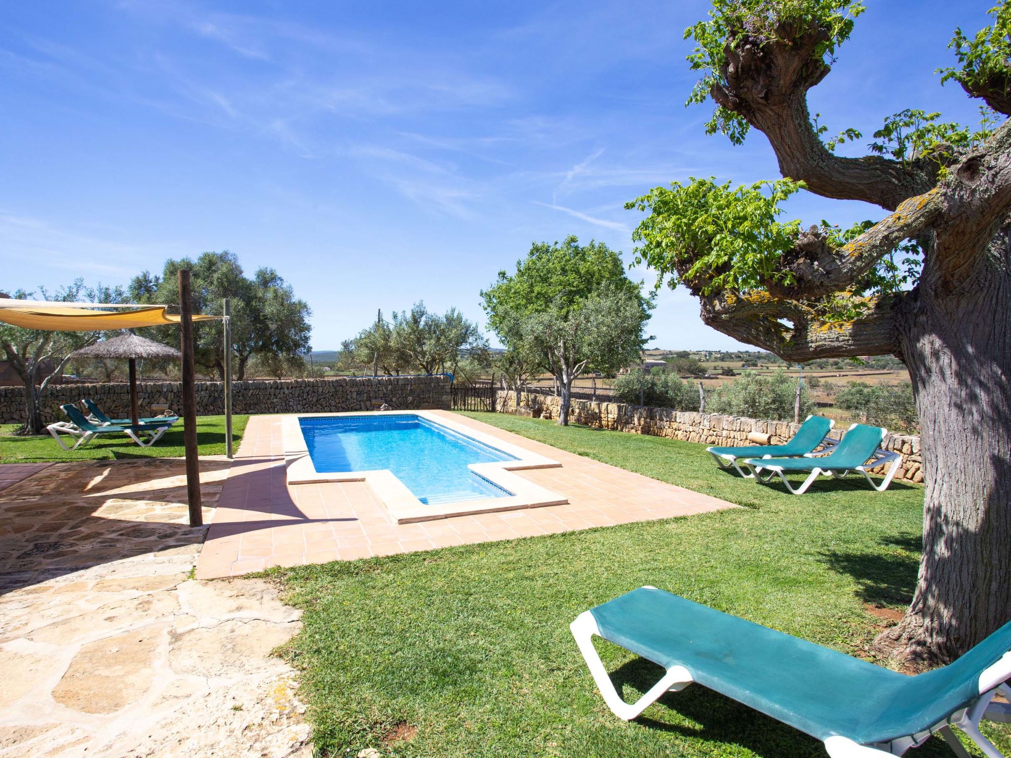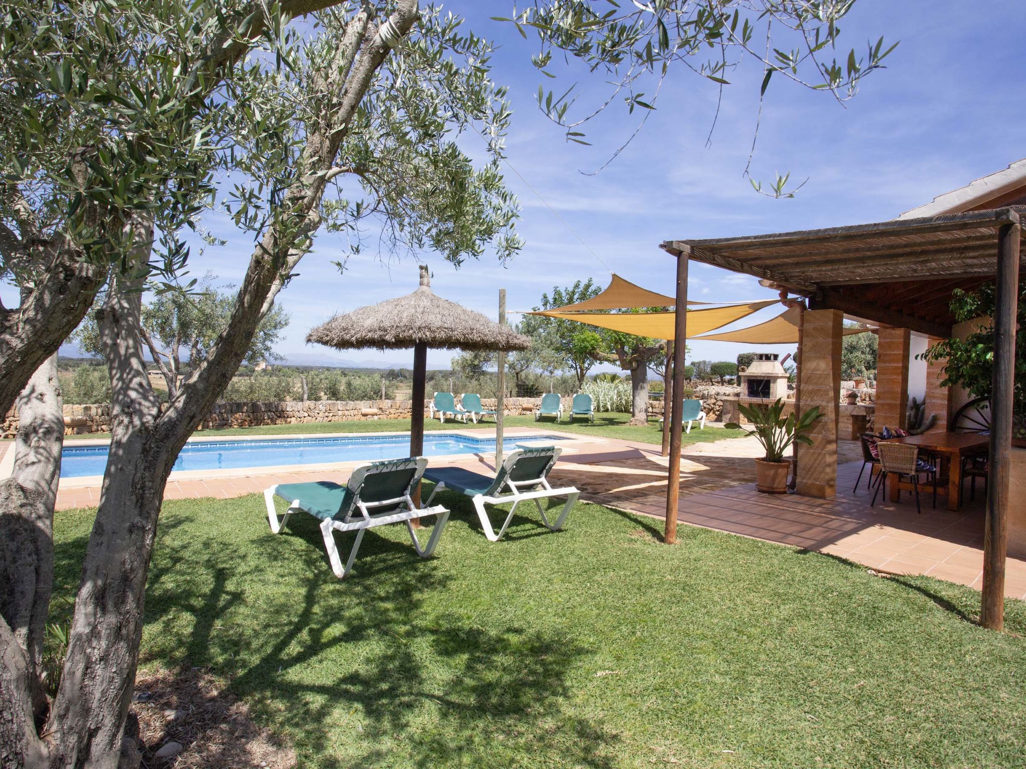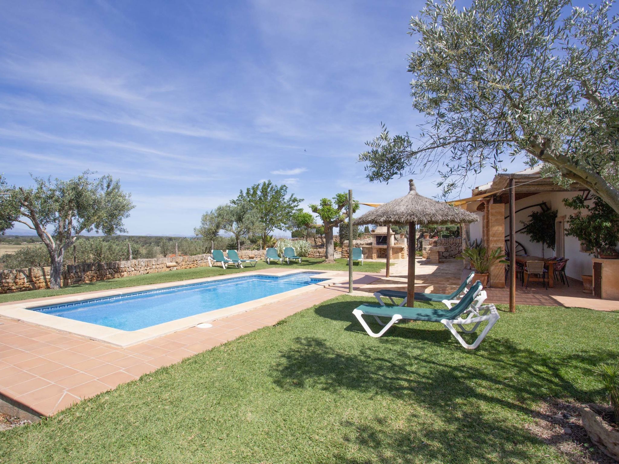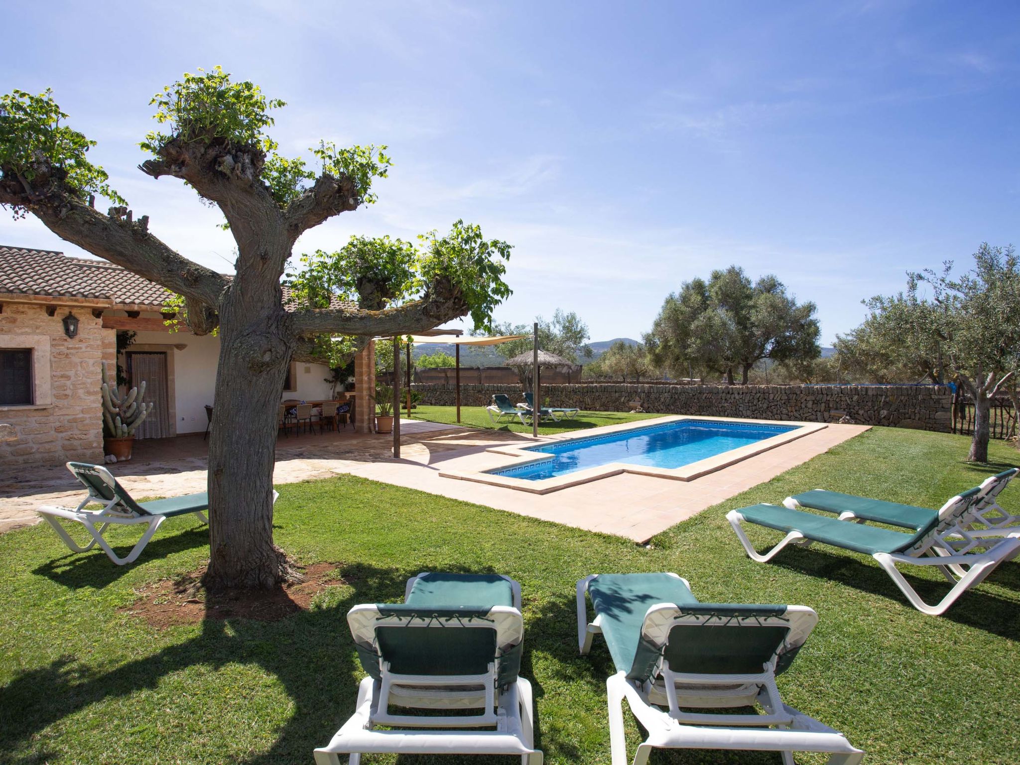 Large, comfortable farmhouse "Ca na Ines", terraced. In the resort de Son Serra de Marina, in a quiet, sunny position residential area (villas), 150 m from the edge of the forest, 5 km from the sea, 5 km from the beach. Private: natural garden, swimming pool angular (8 x 4 m, depth 140 - 220 cm, seasonal availability: 01.Mar. - 30.Nov.). Patio, arbour, pergola, garden furniture, barbecue, pool maintenance by the owner/gardener. In the house: internet access, WiFi, storage room for bicycles, air conditioning, washing machine. Parking at the house. Grocery 4.5 km, restaurant 6 km, bar 6 km, bus stop "Parada 55042 Bus stop" 5 km, ferry "Alcúdia" 20 km, sandy beach "Playa de Son Serra" 5 km, rocky beach "Playa de Son Real" 6 km. Sports harbour 5 km, walking paths from the house 5 km, cycle lane 150 m. Nearby attractions: Pueblos:Sta.Margalida,Can Picafort,Artà, Palma 61 km, Mallorca Fashion Outlet & Cinema 51 km, Faro de Formentor 50 km, Platja d'Es Trenc 60 km. Hiking paths: Finca Son Real 6 km, Ermita de Betlem, Serra de Tramuntana. Please note: car recommended, no lift. Object suitable for 8 adults. The owner does not accept any youth groups. Airfield 64 km from the property.
