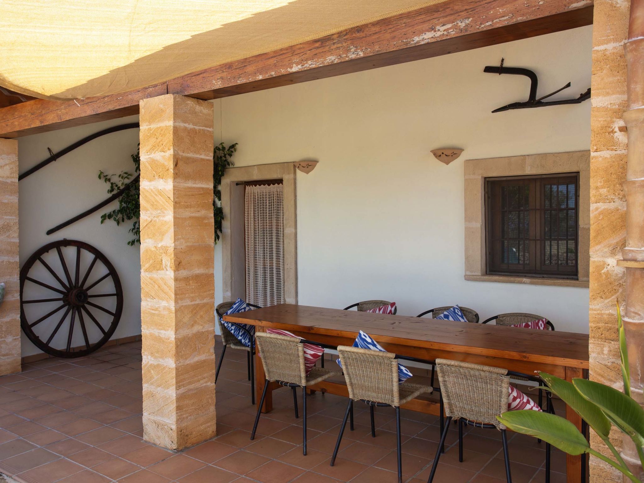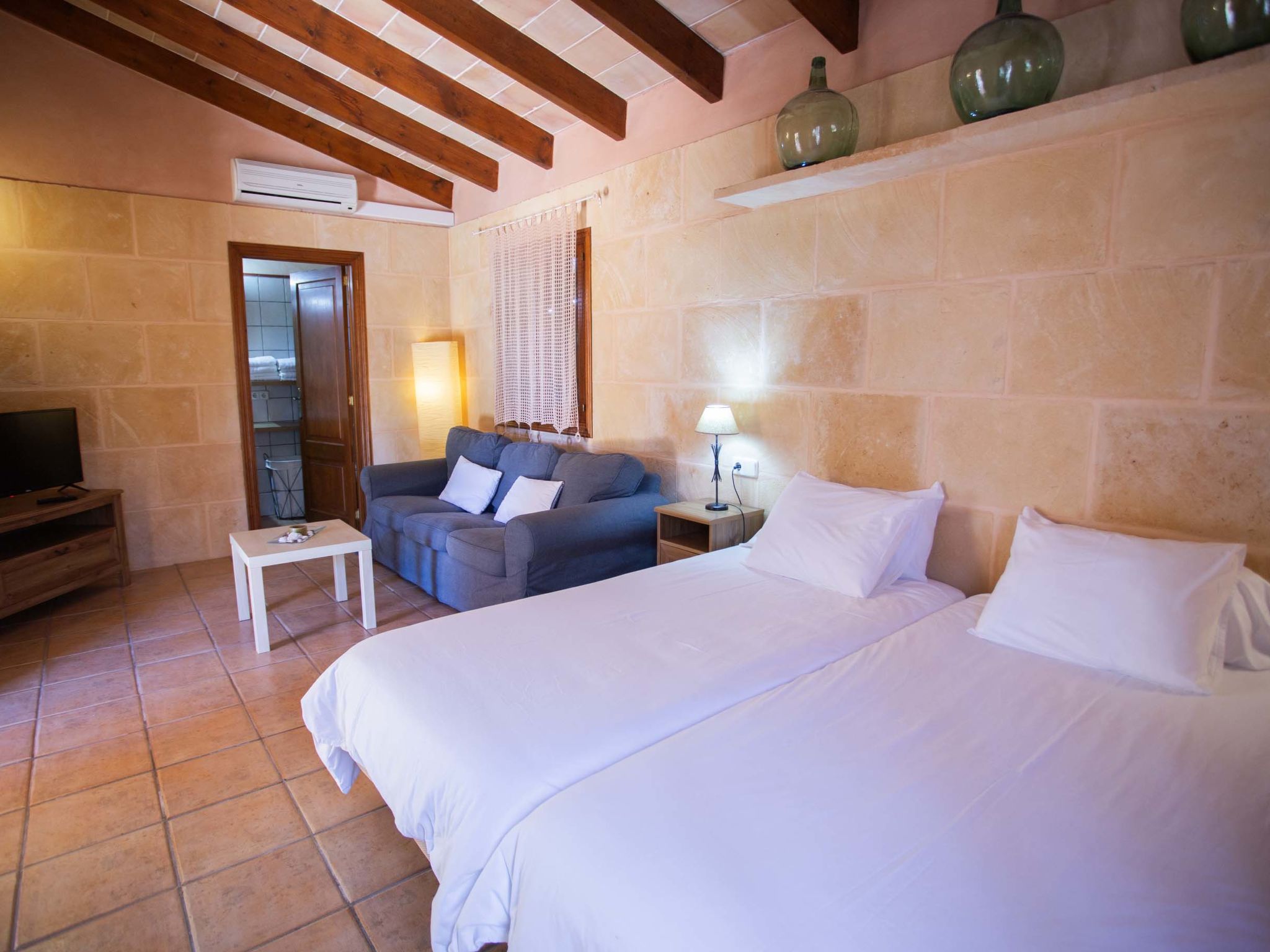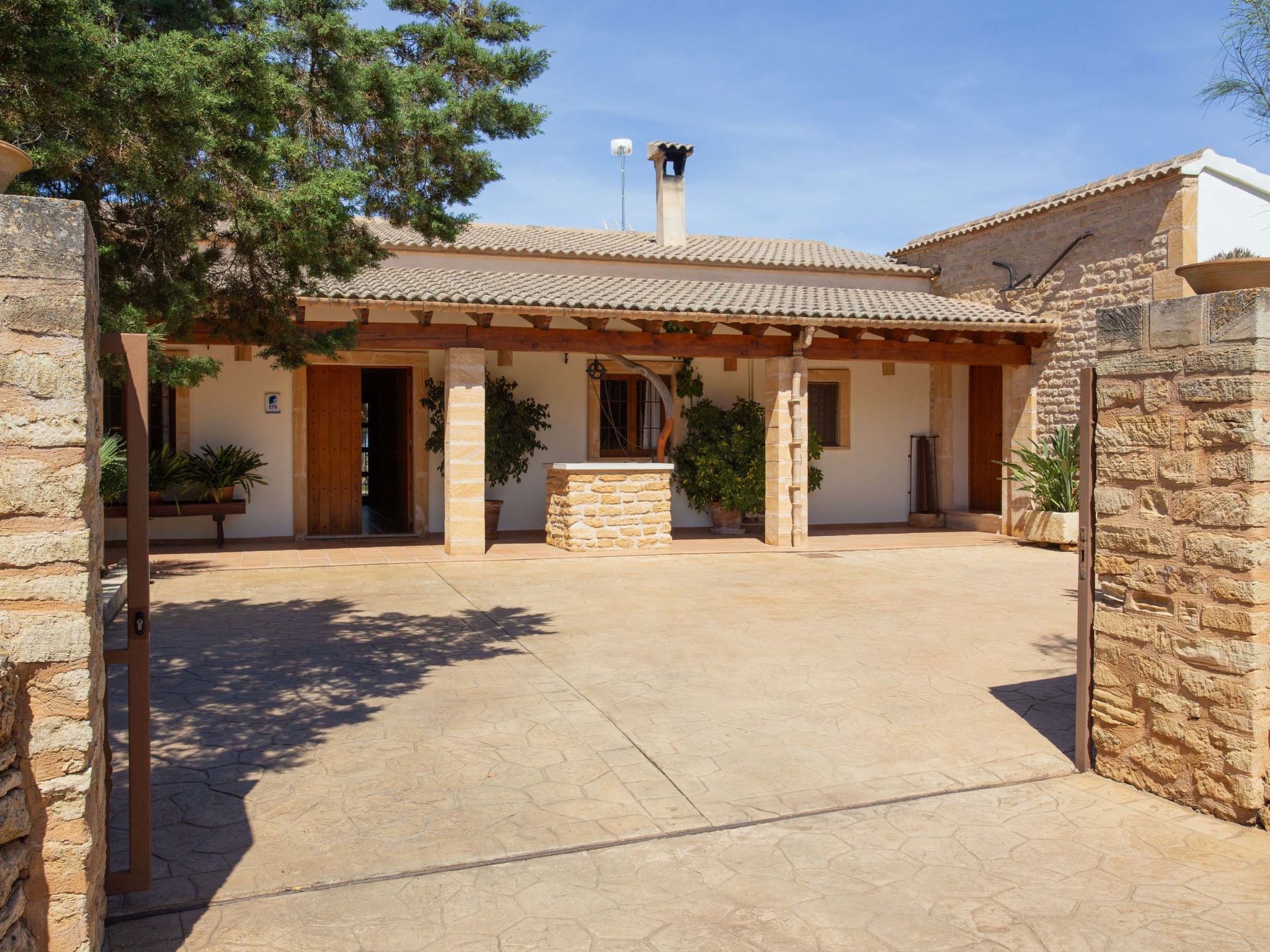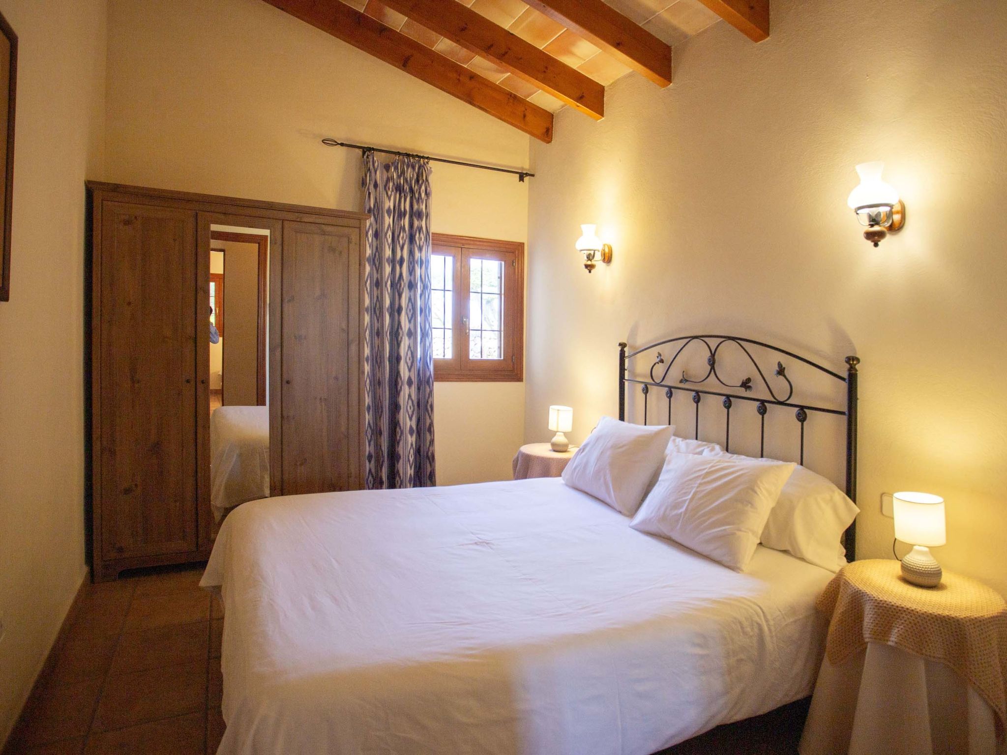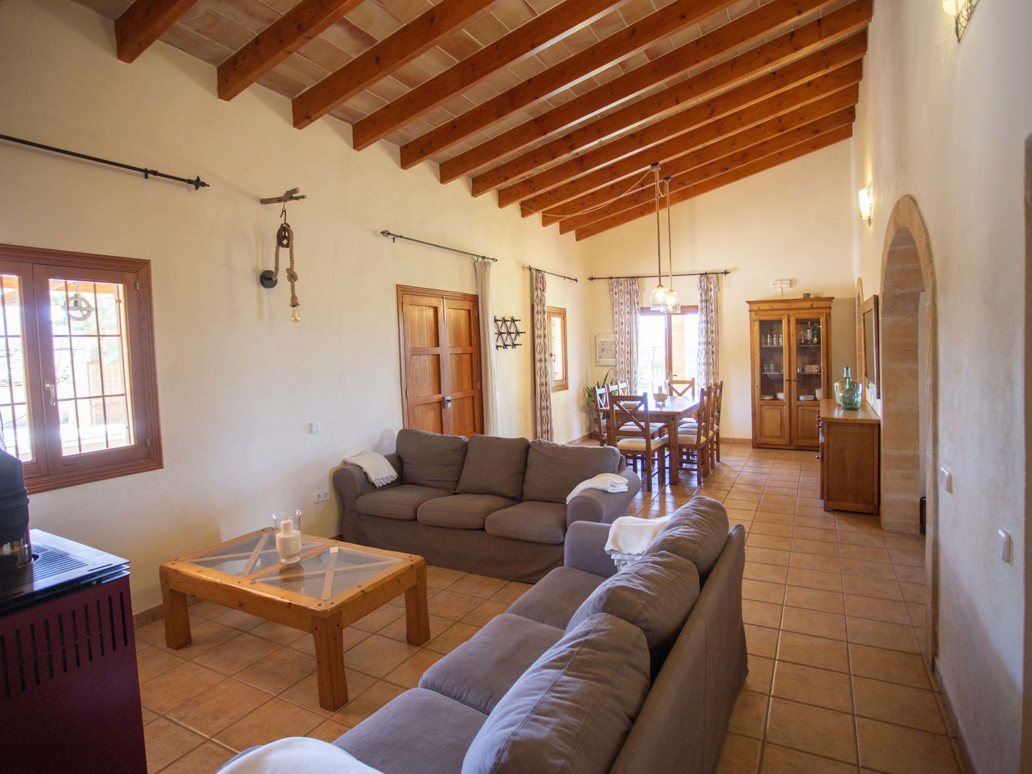 "Ca na Ines", 5-room house 185 m2. Object suitable for 8 adults. Spacious, practical and comfortable furnishings: living/dining room. 1 double bedroom with 2 beds (90 cm, length 190 cm), air conditioning and forced-air heating. 25 m2, Studio with 2 beds (90 cm, length 190 cm), shower/WC, air conditioning and forced-air heating. 1 double bedroom with 1 french bed (1 x 135 cm, length 190 cm), air conditioning and forced-air heating. 1 double bedroom with 1 french bed (1 x 150 cm, length 190 cm), air conditioning and forced-air heating. Large kitchen (4 hot plates, oven, dishwasher, toaster, kettle, microwave, electric coffee machine). Bath/WC, shower/WC. Air-conditioning, forced-air heating. Heating not available in all rooms. Natural stone floors. Garden. Terrace furniture, barbecue, deck chairs (8), covered balcony. Very beautiful view of the countryside. Facilities: washing machine, iron, children's high chair, baby cot for up to 2 year olds, hair dryer. Internet (WiFi, free). Parking at the house. Suitable for families. ETV/619 // Reg. Nr.: ESFCTU000007011000204438000000000000000000000ETV/6196